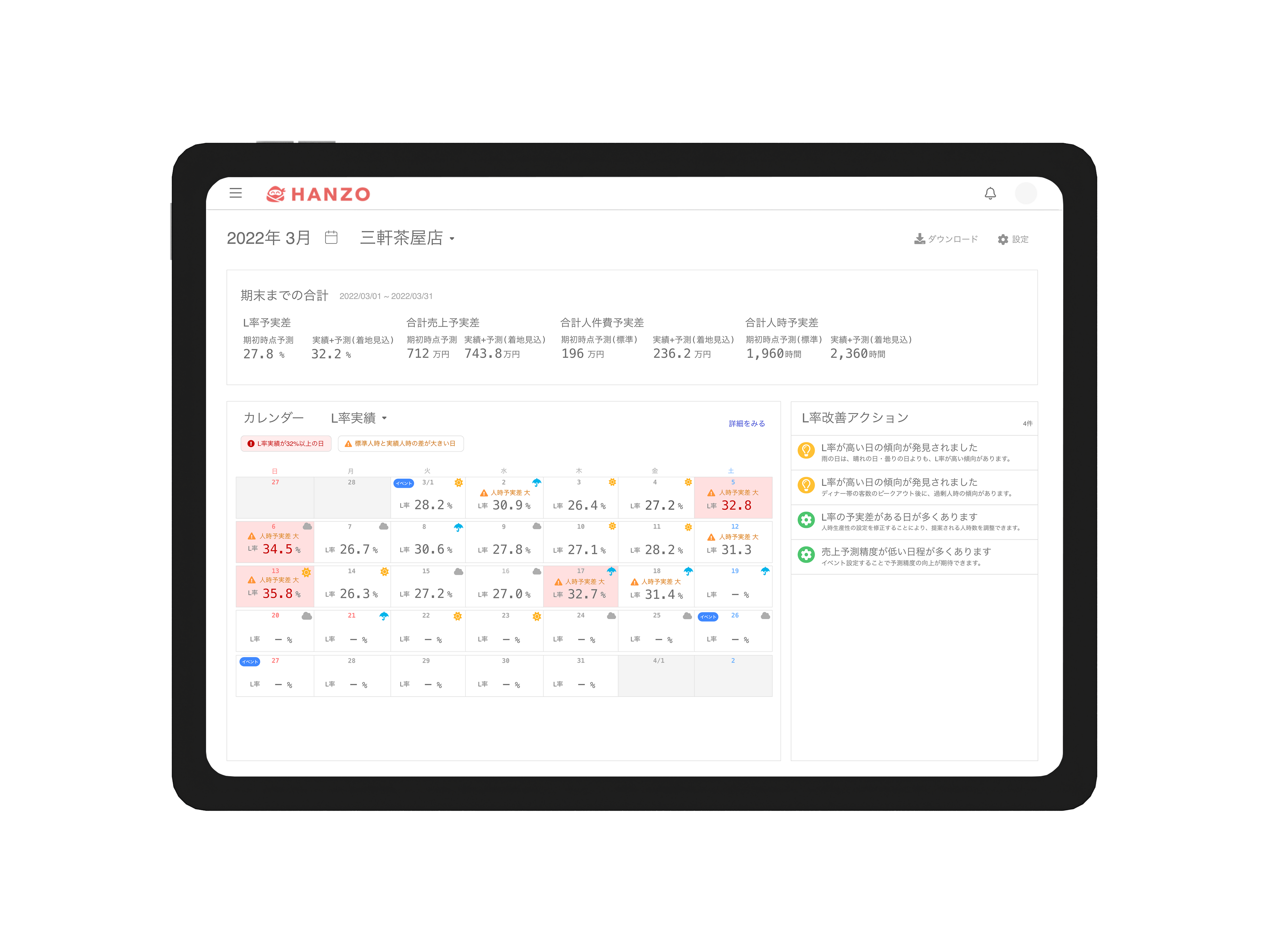 当社が飲食店向けに提供する「HANZO 人件費」は売上の予測や、売上に対する最適な必要人員数の算出などをAIが自動で行い、店舗責任者が行っていたシフト作成業務などの負担を軽減するクラウドサービスです。