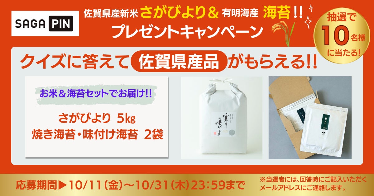記事の公開にあわせて、「SAGAPIN STORY」内に隠された、簡単なクイズに答えると、抽選で10名様に「新米 さがびより&有明海産 海苔」のセットが当たる、プレゼントキャンペーンを実施します。