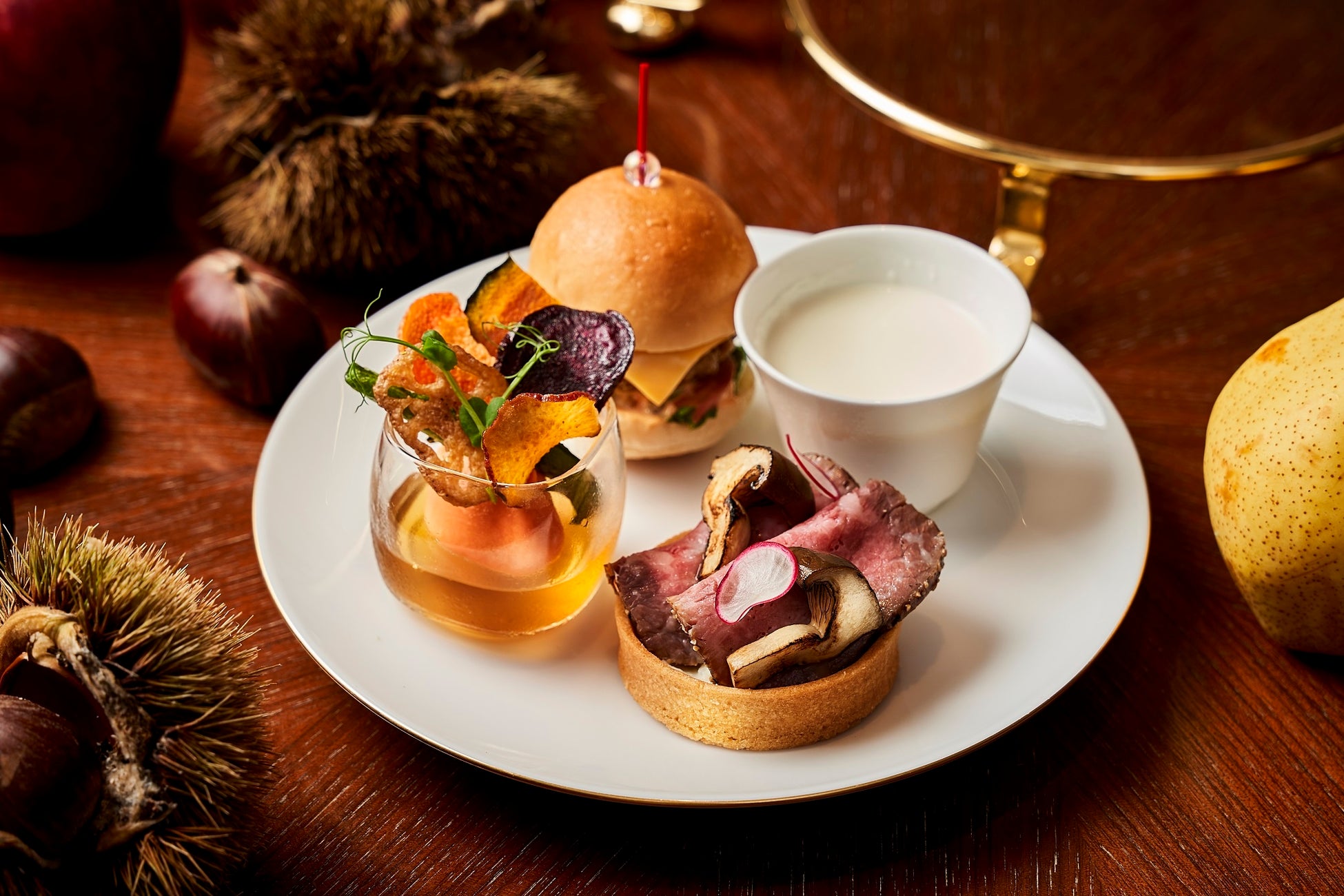 「芋栗南瓜(いもくりなんきん)」をはじめとする魅力の秋の味覚を種類豊に使用した秋限定のアフタヌーンティーが登場。スイーツは、かぼちゃと紫芋の2色のモンブランクリームが濃厚な味わいの「かぼちゃと紫芋のモンブラン」やりんごと紅茶のムースが相性抜群の「りんごと紅茶のムース」、丹波栗のシャンティをふんわりとしたロール生地に包み、優しいカシスの酸味を添えた「栗とカシスのロールケーキ」など、7品がプレートを彩ります。セイボリーは、「トリュフ風味の牛肉のタルトレット」や「サーモンリエットとコンソメジュレ」など華やかに仕上げ、食べ応えもあり秋の美味を満喫いただける内容です。スイーツ、セイボリー共に秋の美味しい食材をたっぷりと使用して表現した、ホテルパティシエがお届けする秋の京都をお楽しみください。