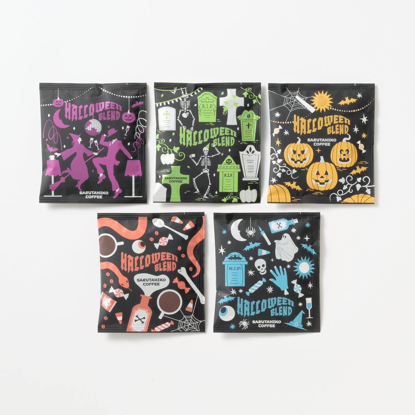 “街中がワクワクした雰囲気に包まれるハロウィンの日にスイーツを囲んで楽しむホームパーティー” がテーマの、秋を感じる中深煎りブレンドに仕上げました。ドライフルーツの濃厚な甘さやタルトの香ばしい風味が広がり、チャイの余韻も感じられる味わいをお楽しみいただけます。また、ドリップバッグは5枚全て異なるデザインで、ハロウィンの時期のプチギフトにもおすすめです。