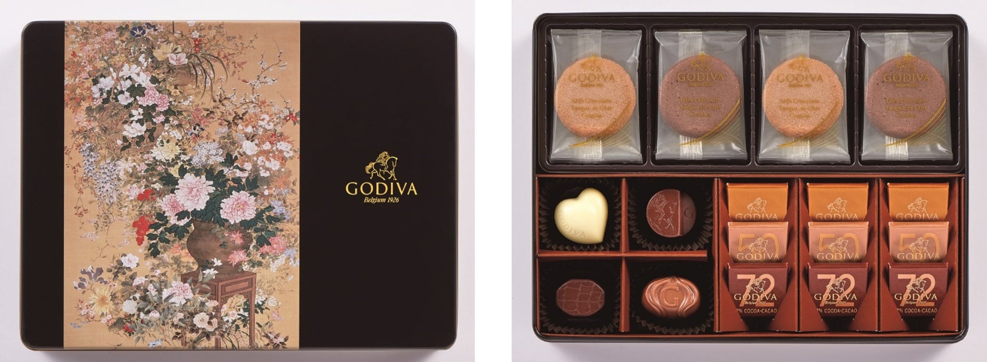 東京国立博物館に所蔵されている「百花闘芳図」をあしらったパッケージに、長く愛されてきたゴディバのチョコレートとラングドシャクッキーを詰め合わせました。