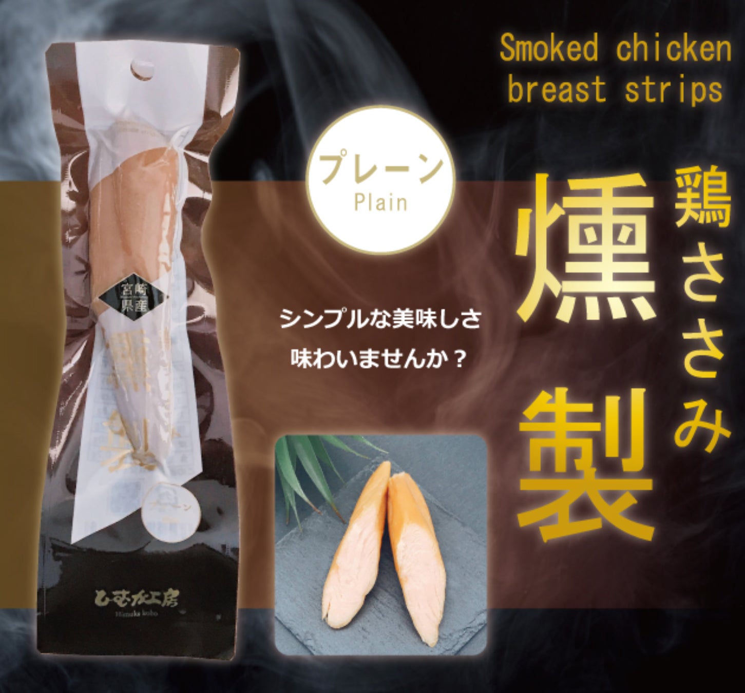 新富町に直営牧場を持つOkazaki Food株式会社のオリジナルブランド「ひむか工房」で職人が厳選した素材を使用し、解体から加工、包装まで一つ一つていねいにつくられています。独自の調味液に漬け込みじっくりと熟成しスモークした鶏ささみ燻製(プレーン)はシンプルな味付けが美味しさを引き立たせます。同ブランドの鶏ささみ燻製(黒胡椒)はANA系アジア航路就航のAIR JAPANの機内購入メニューにも採用されています。