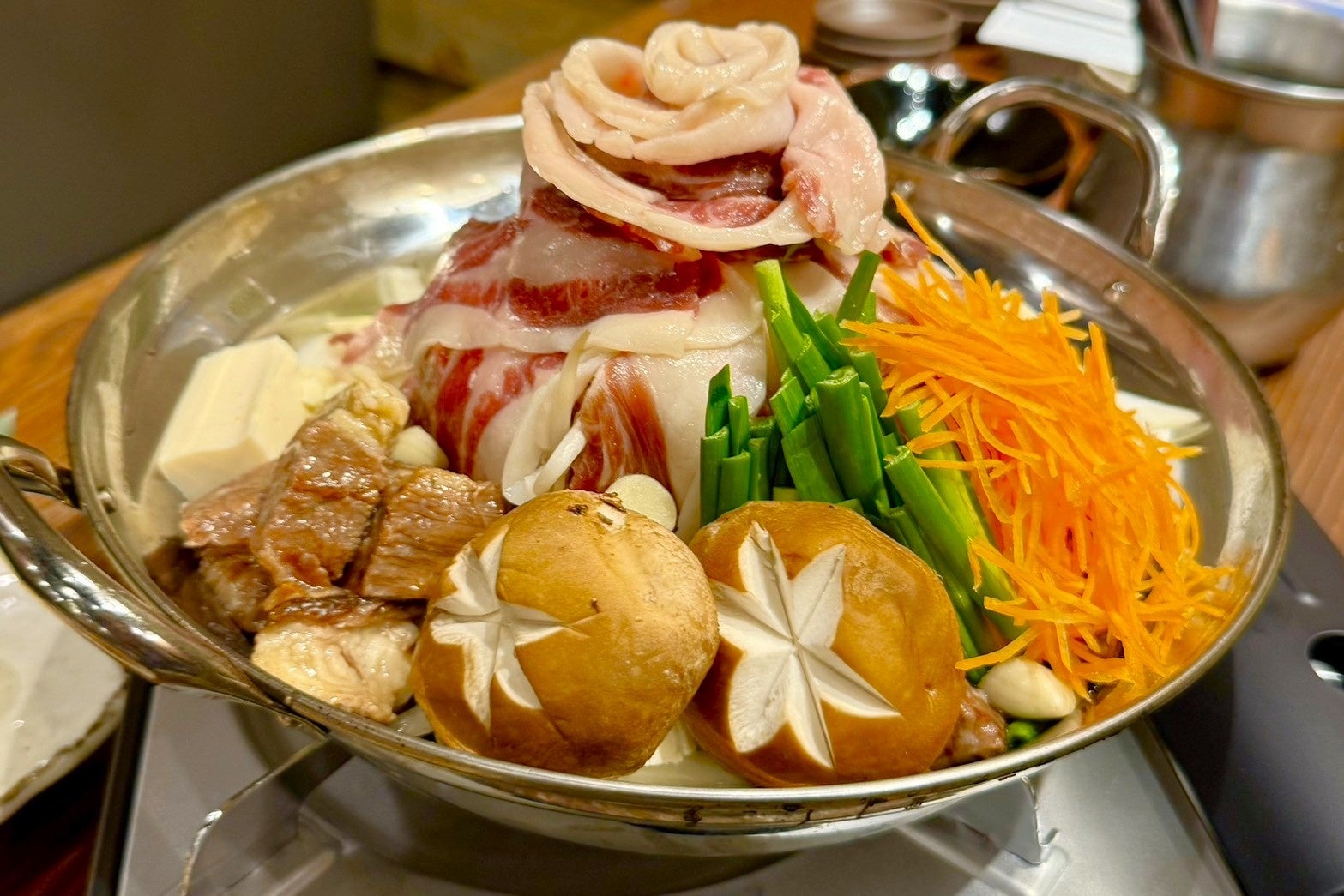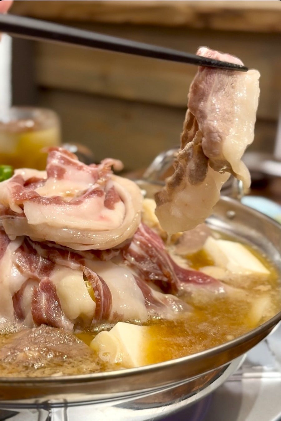 今回は鍋との相性を考えた2種類の部位を使用しました。鍋の真ん中にそびえるトモバラは、⾺⾁ならではの柔らかさと脂の⽢みを堪能でき、スネ⾁は煮込むことでコラーゲンがたっぷり溶け出し、⼝の中でホロホロとほどける⾷感が楽しめます。この鍋を通して、⾺⾁の持つ魅⼒と、冬ならではの温かな⾷事をお楽しみください。