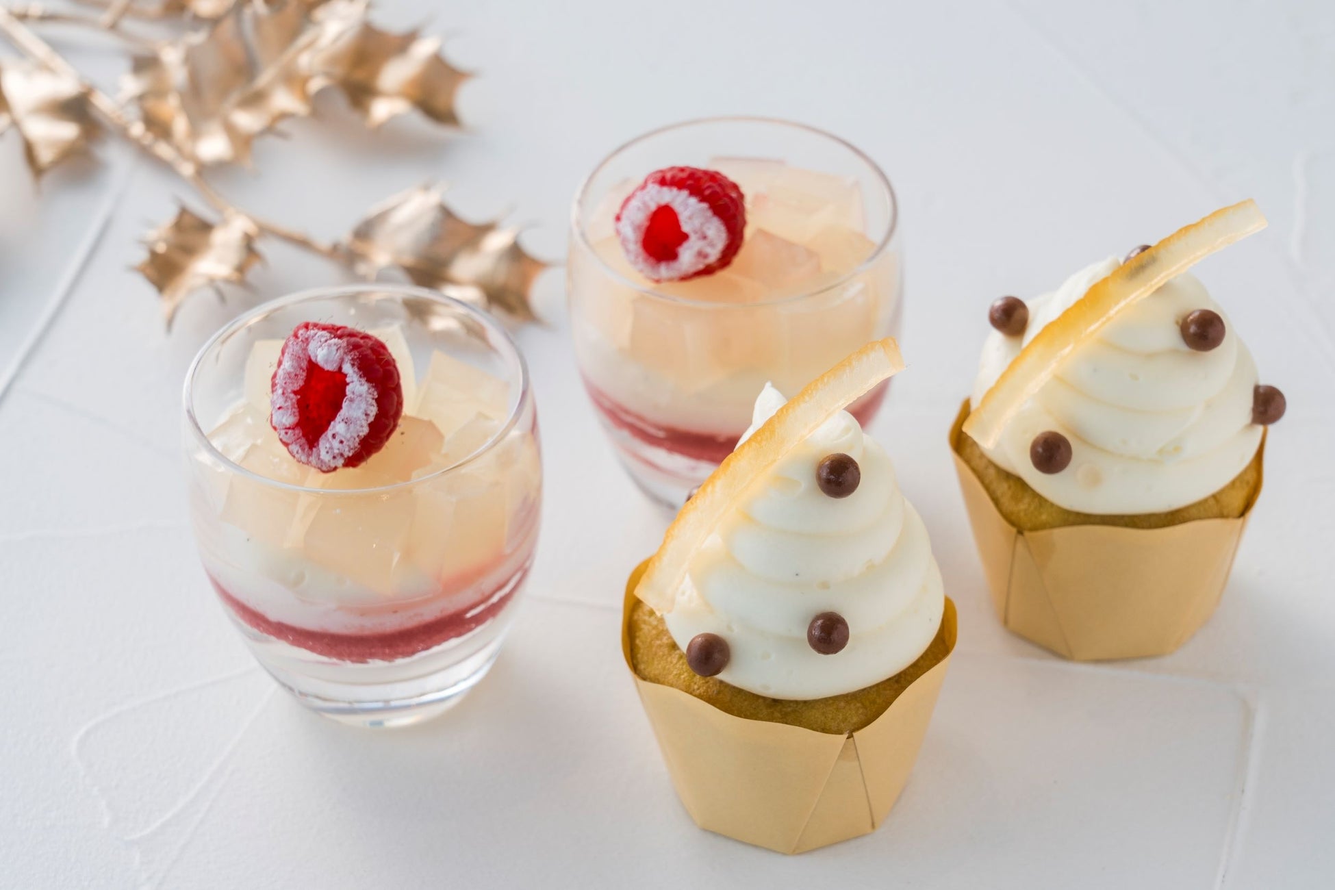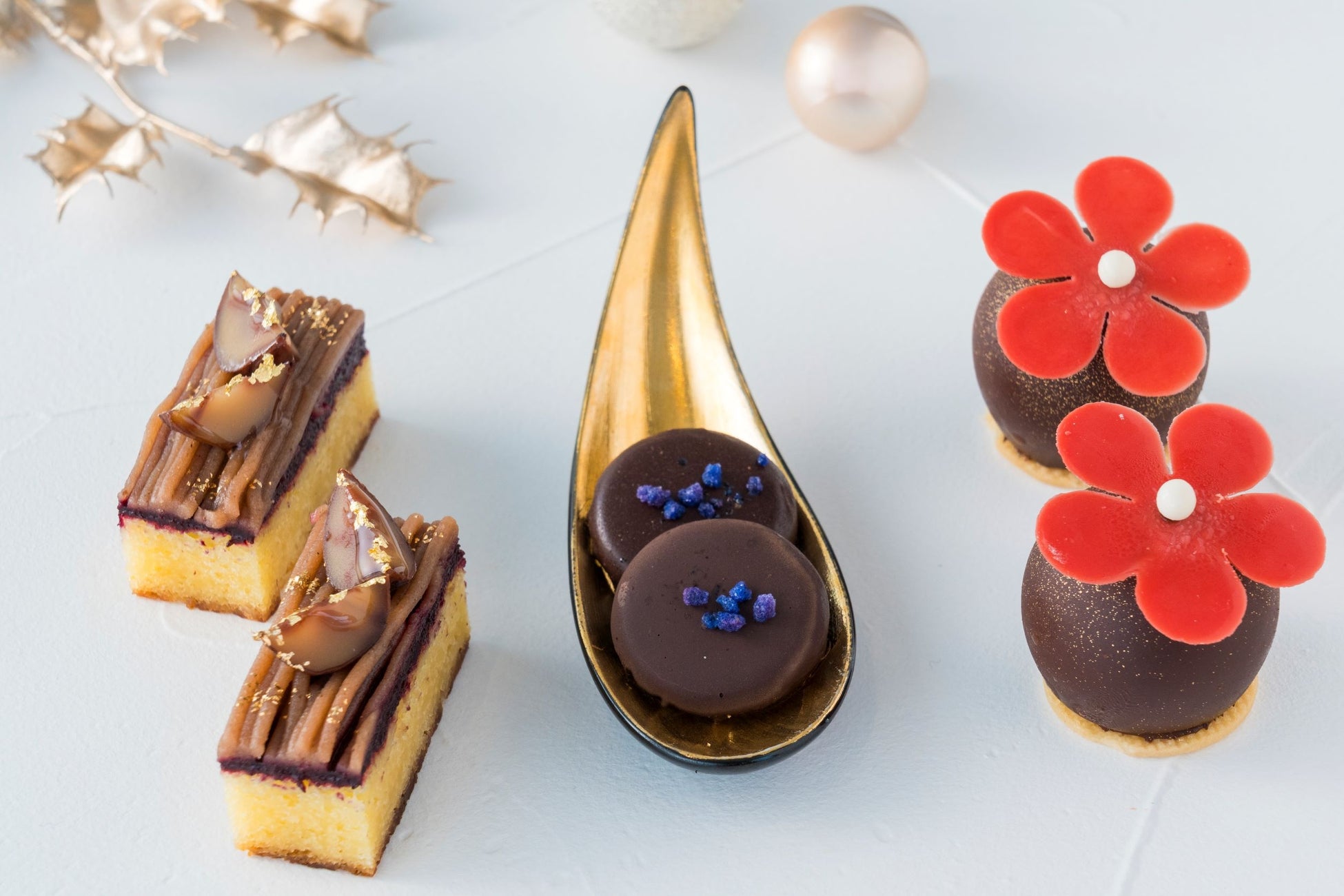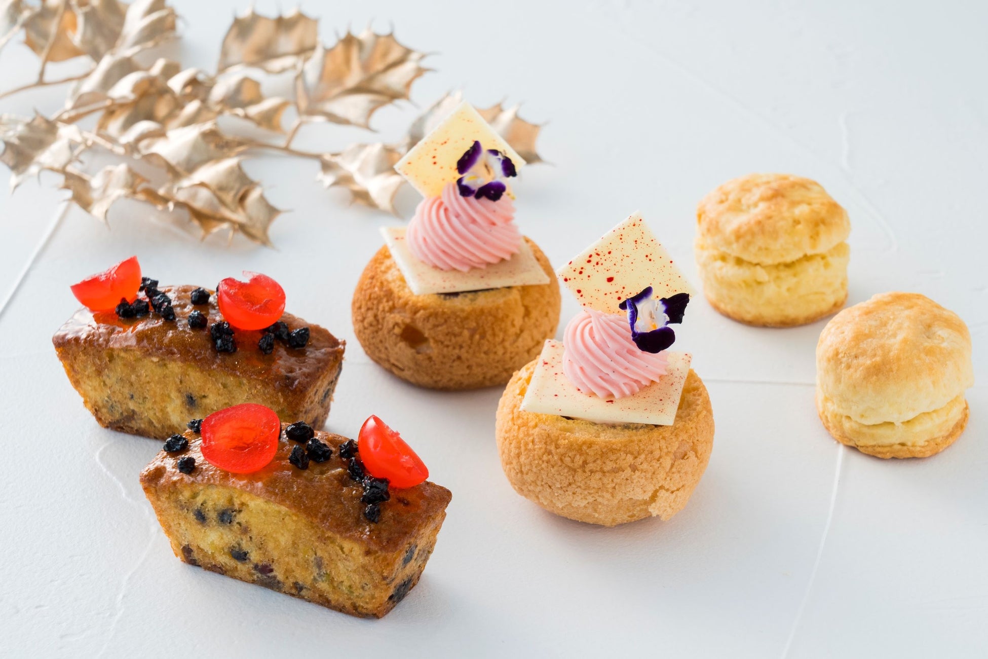 甘いバニラクリーム、甘酸っぱいラズベリージャムとショートケーキスポンジを層にし、仕上げに爽やかな柚子の風味が漂う柚子ゼリーとフレッシュなラズベリーをのせた「バニラとラズベリーのトライフル」は、冬に咲く可憐な花をイメージし創りました。グリオットチェリーをコンフィする事で特徴的な強い酸味をまろやかにし、チェリー本来の甘さを最大限に引き出したジャムをバター香るシュー生地で包み込みエディブルフラワーをあしらった「グリオットチェリーのシュークリーム」は、クランベリーのシャープな酸味とグリオットチェリーの甘味が調和した複雑で深みのある味わいが印象的な一品です。レモン風味漂うカップケーキに滑らかなレモンクリームを絞り、レモンピールとチョコレートを飾った「レモンバニラカップケーキ」は、冬に旬を迎えるレモンを贅沢に使用したスイーツです。「ホワイトチョコレートのブラウニー」は、カシスの酸味が栗のまろやかでコクのある甘さを引き立て、仕上げに栗とマロンクリームにまぶした金箔が華やかさを添えます。シナモンやナツメグなど冬の訪れを感じさせるスパイスと濃厚なベリーゼリーをチョコレートムースで包み込んだ「スパイスベリー・バブル」は、ベリーの酸味とスパイスの豊かな香りがビターチョコのリッチな風味を引き立て、花の形を模ったチョコレートが目を引く一品です。その他、アプリコットやレーズン、レモンピール、オレンジピールなど多種多様なフルーツを使用した「イングリッシュ・フルーツケーキ」やホテルメイドの「プレーンスコーン」、「カシスボンボン」をご用意致します。