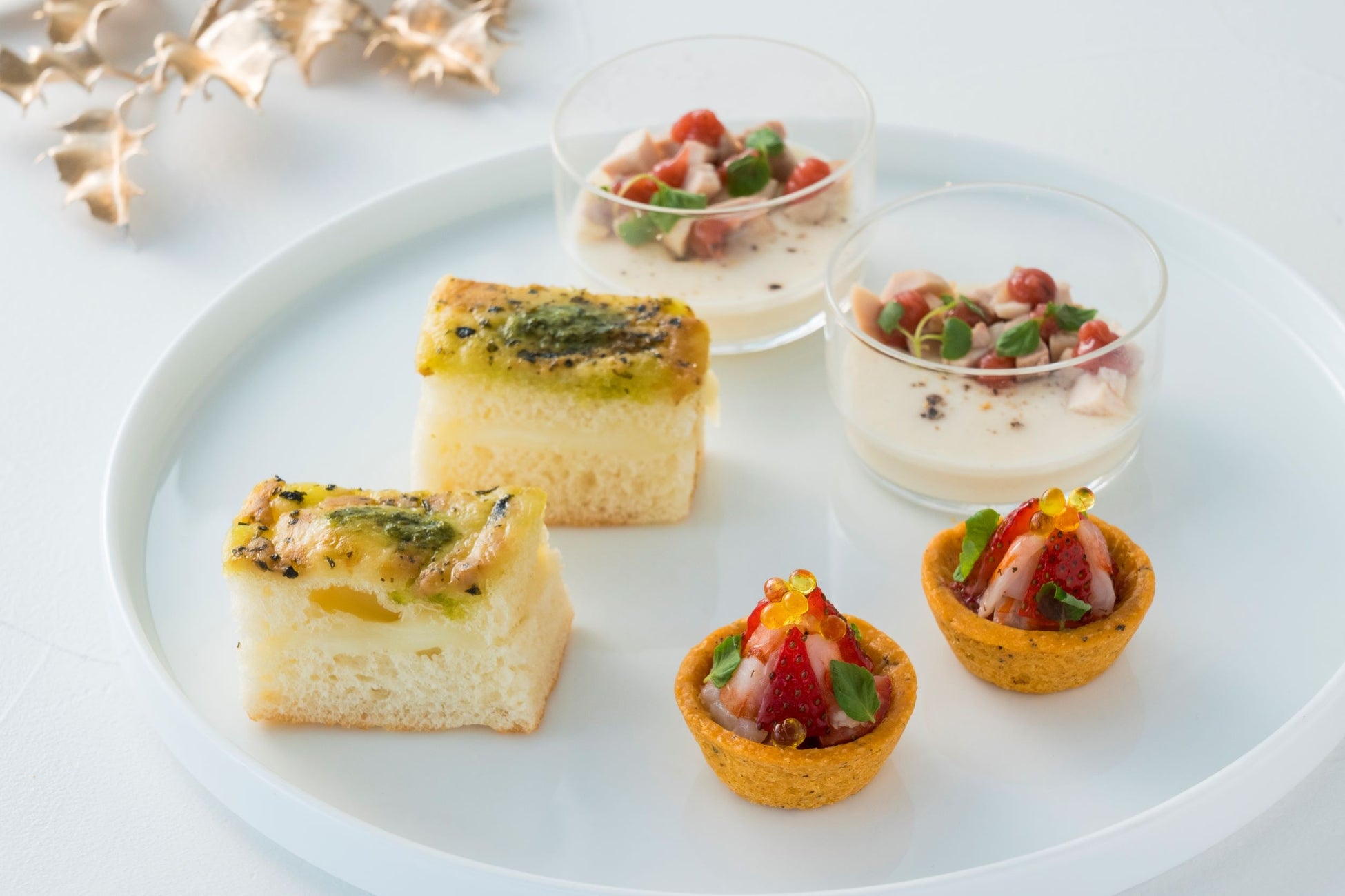 また、フレッシュいちごを使用した「いちごと海老のタルトレット」、ココナッツの風味がアクセントの「豆腐のパンナコッタ ポーチドチキン」、優しいミルク風味のスカモルツァチーズで創る「ガーリックコンフィのフォカッチャ」の3種の華やかなセイボリー(軽食)とスープもスイーツと一緒にお楽しみいただけます。