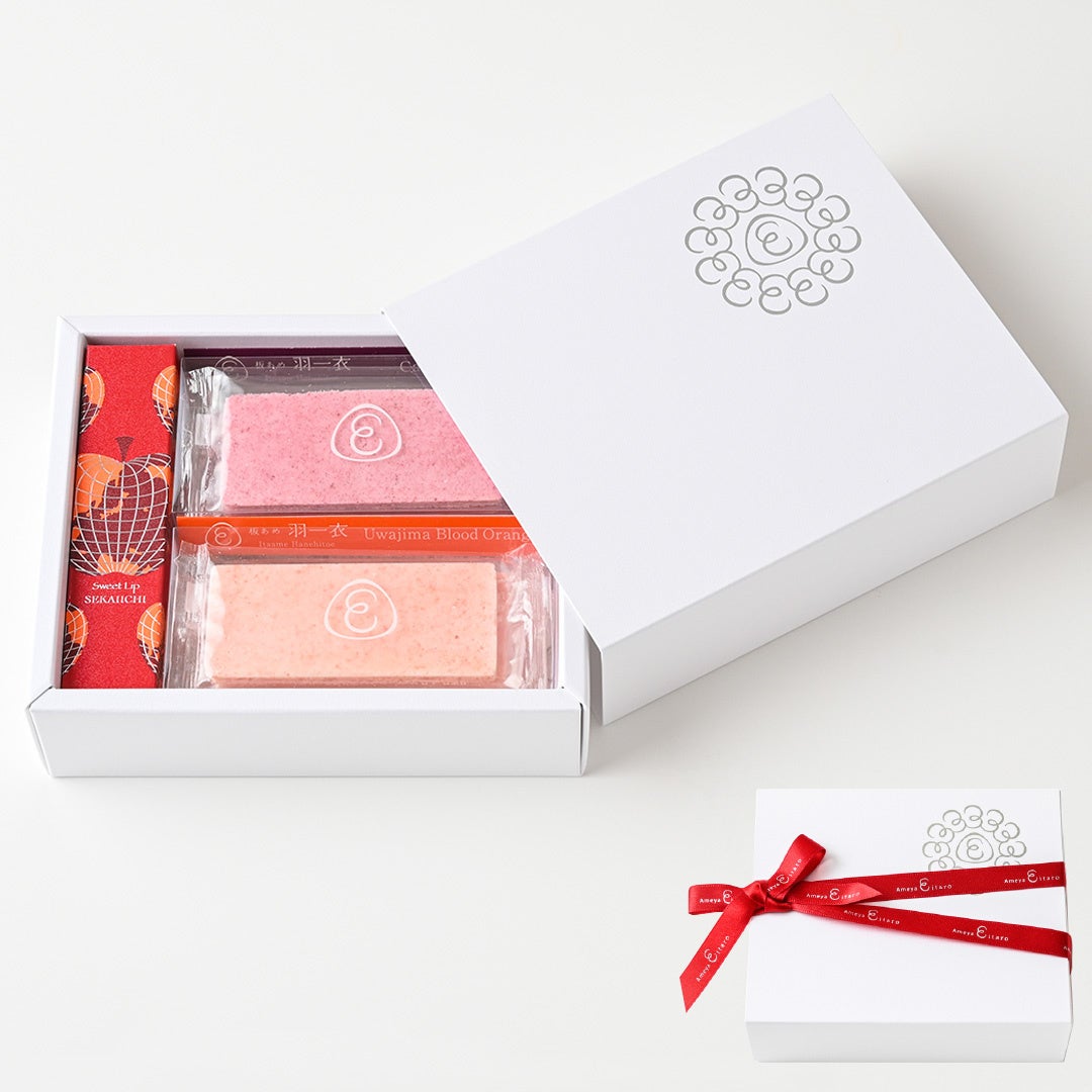 秋のおすすめ商品をセレクトしたギフトセットです。みつあめ スイートリップは「世界一」。サイズの大きい「世界一」という品種のりんごを使用しており、パッケージにはその名前から世界地図を連想したデザインが施されています。板あめ 羽一衣からはキャンベルアーリー(ぶどう)と宇和島ブラッドオレンジの2種類入り。