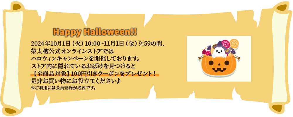 また、ハロウィンキャンペーンとして、オンラインストア内に隠れているおばけを探し出すと、全商品に適用可能な100円引きクーポンコードをプレゼントいたします。
