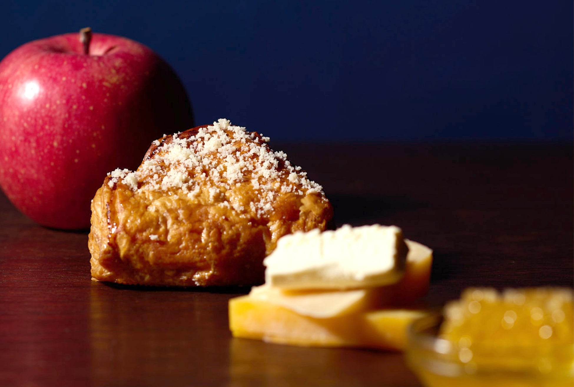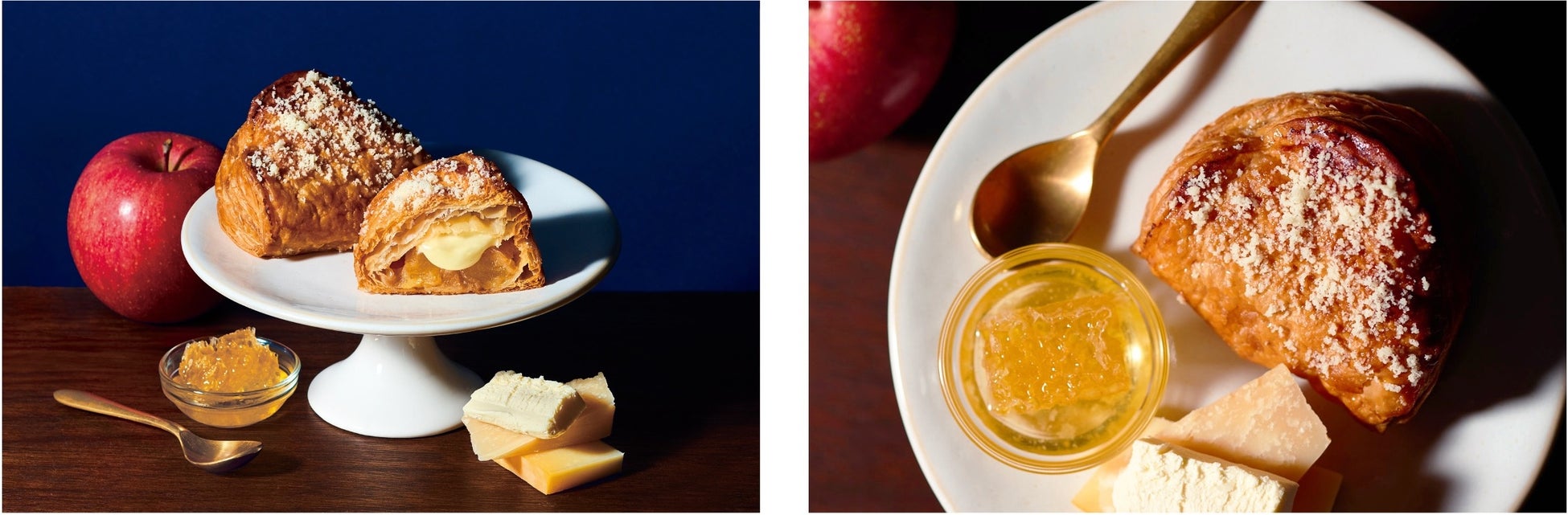 カスタードクリームの代わりにゴーダチーズ、クリームチーズ、はちみつを使用した濃厚なハニーチーズクリームをたっぷりと注入し、コク深く濃厚な甘みと柑橘のようなフルーティーで爽やかな香りのするひまわりのはちみつと、深く豊かな風味が特徴のパルメザンチーズをトッピングしました。はちみつのやさしい甘さとチーズの塩味と風味との好相性を楽しめるアップルパイです。