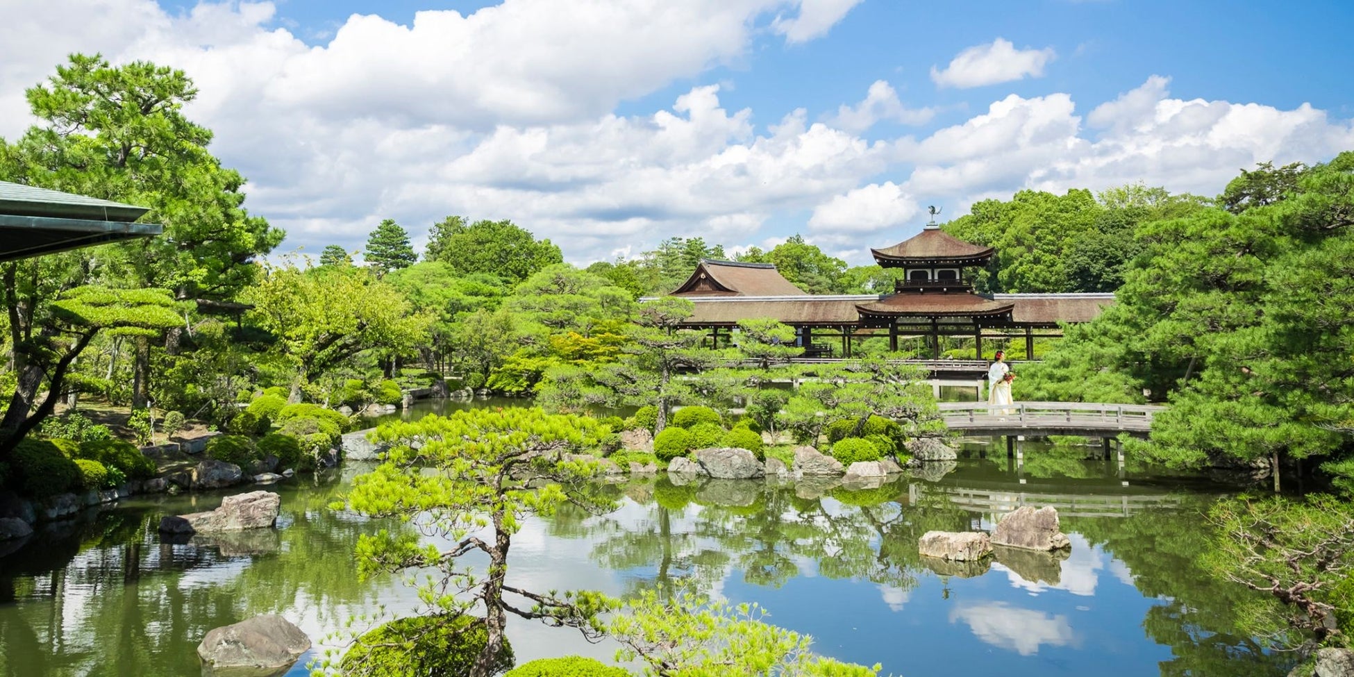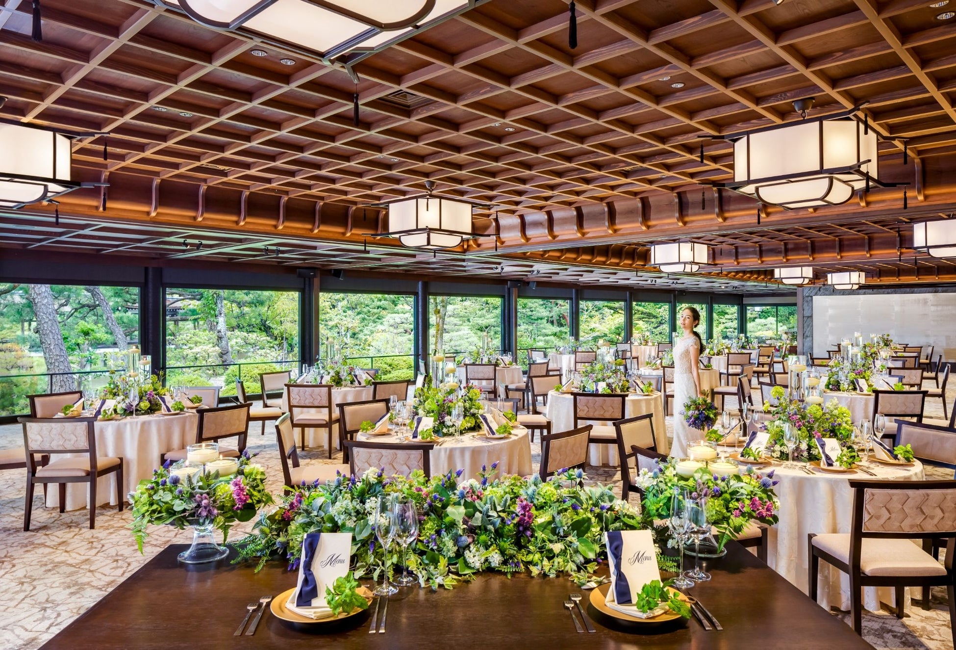 京都の三大祭りの一つである「時代祭」が執り行われる平安神宮は、1895年(明治28年)に建立された京都随一の神宮。多くの重要文化財、登録有形文化財を持ち、境内にある平安神宮神苑は国指定名勝。「平安神宮会館」は神苑を借景に、平安神宮御鎮座70年並孝明天皇100年祭を記念して境内に建てられました。ラウンジではアフタヌーンティーが楽しめ、2つのバンケットスペースではパーティや披露宴を承っています。