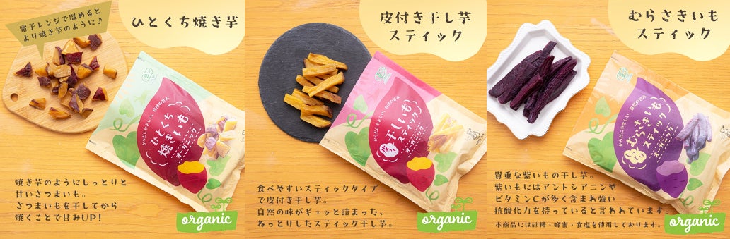 オーガニックのお芋は、お芋の素材を活かした素朴な味わいが特徴のおやつです。商品は「有機ひとくち焼きいも」、「有機皮つき干しいもスティック」、「有機しっとり紫いもスティック」の3種展開で、一度に食べ切れるサイズの小袋が2袋入っております。