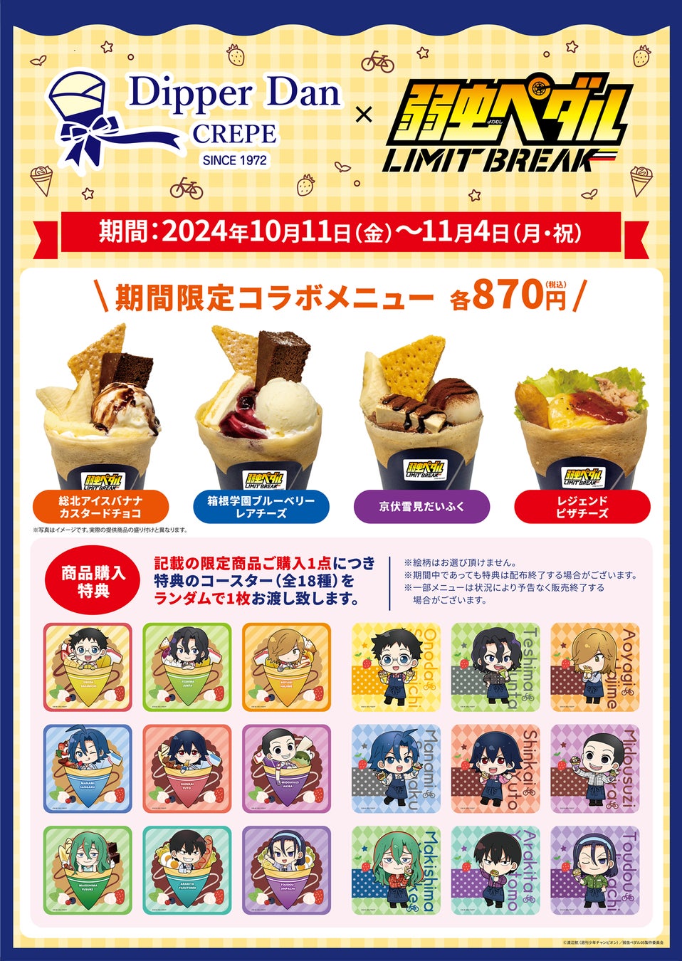 クレープチェーンとして売上日本一(富士経済調べ)の「ディッパーダン」を展開している株式会社オレンジフードコート(本社:東京都江東区、代表取締役:越智 雅也)は、2024年10月11日(金)より2024年11月4日(月)の期間、TVアニメ「弱虫ペダルLIMIT BREAK」コラボキャンペーンを開催いたします。