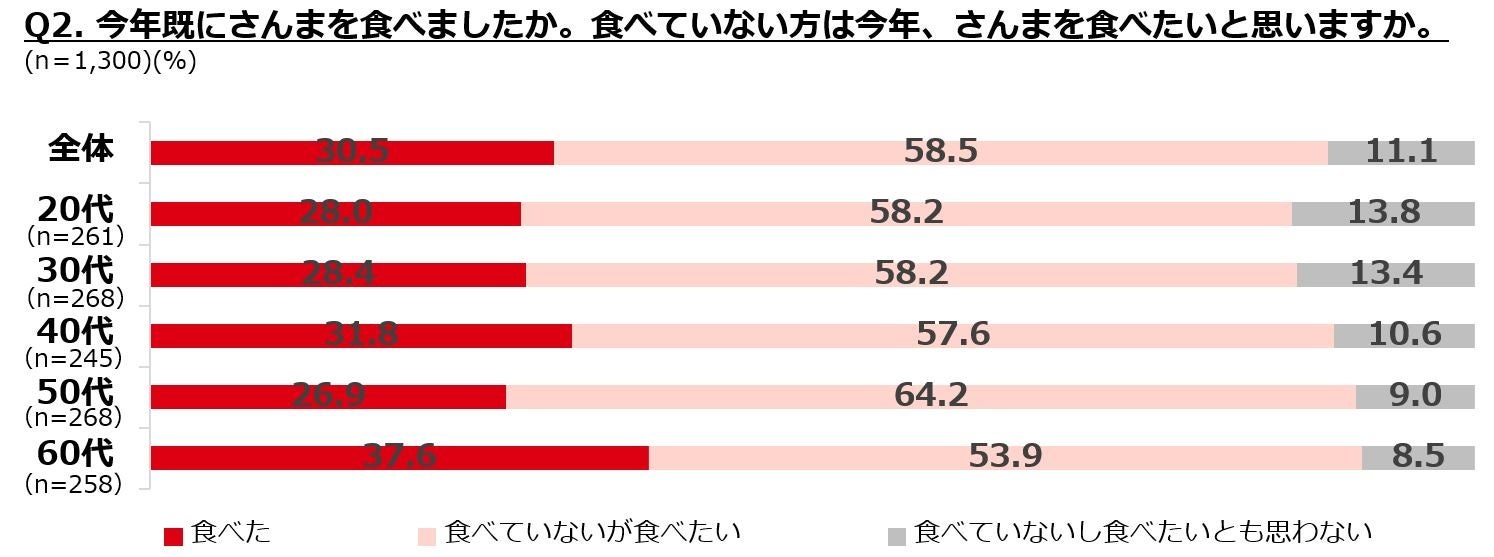 ②今年さんまを食べた人は3割で、60代は4割。食べていないが食べたい人は6割弱。