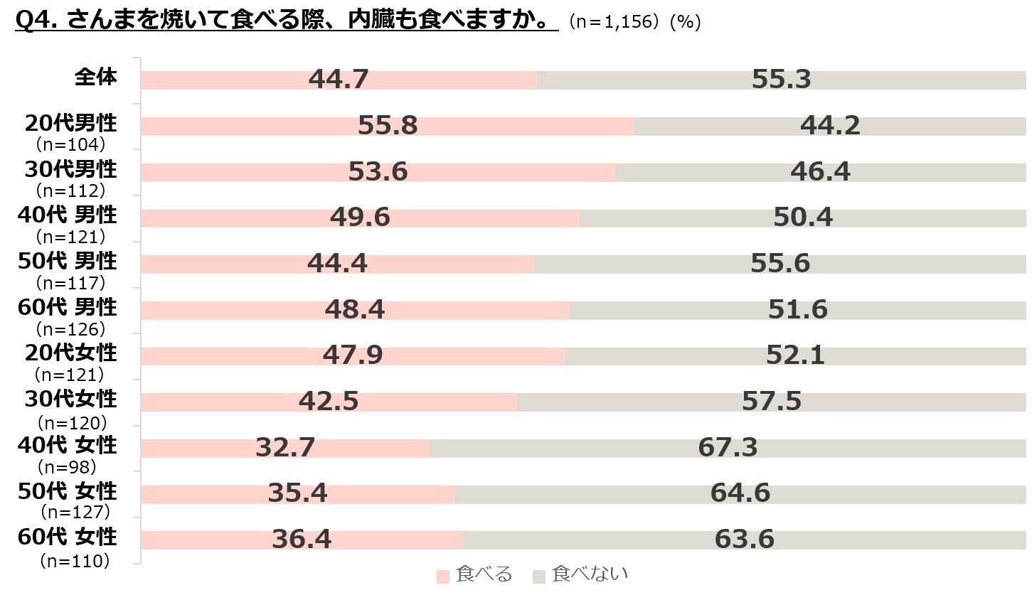 ところで、今回の調査結果では若い男性ほど内臓まで食べる傾向が強いという結果になりました。女性でも20代、30代で内臓を食べる方が4割を超えており、新しい世代がさんまの風味をより楽しんでいる様子がうかがえました。内臓については、私は真逆の結果が出ると予想していましたが、予想を裏切る意外な調査結果にさんまの奥深さを感じました。