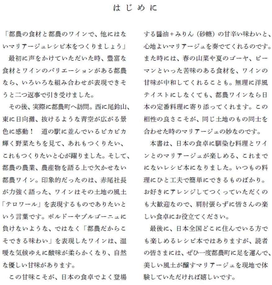 日本のローカルを虫眼鏡のような視点で見つめてみると、そこにはまだまだ新しい食の発見が隠れています。本書で提案するのは日本ワインの“地酒的”な愉しみ方。同じ産地で生まれた食材とワインを合わせる、ワイン文化の王道です。食材の宝庫都農町の魅力を大橋みちこさんが存分に引き出した1冊が、読者の食卓とワインライフを豊かにすると確信しています。