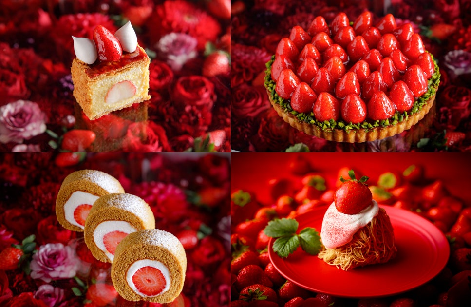 「博多あまおう」の弾けるようなみずみずしい甘さと、サクサクのパイ生地、特製のカスタードクリームが相性抜群の『あまおうナポレオンパイ』や、ご注文いただいてから目の前で仕上げる『生絞りモンブラン”あまおう”』に加え、ロールケーキやタルトなど定番のいちごスイーツも登場します。