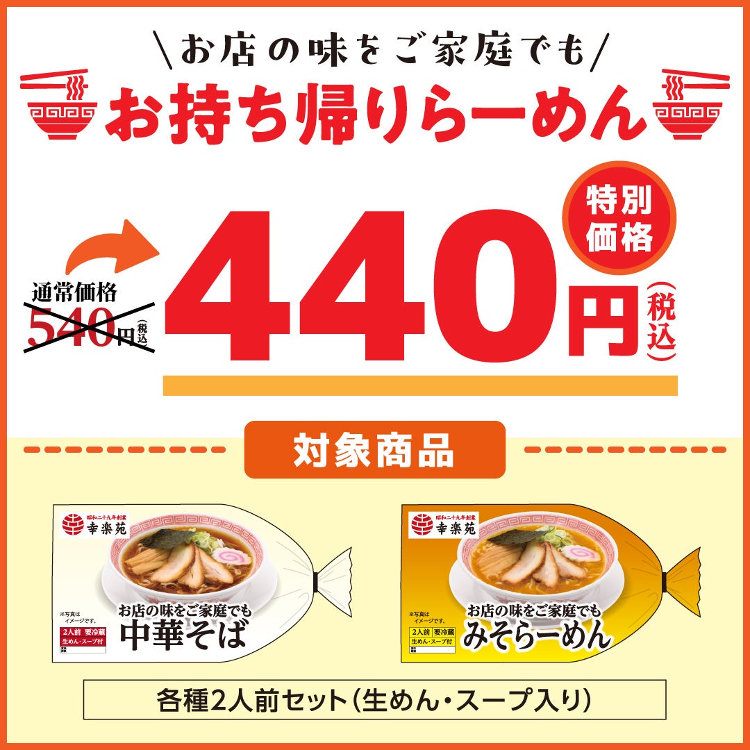 さらに、同日より期間限定で、「お持ち帰りらーめん(中華そば・味噌らーめん)2食入り」通常価格540円を、特別価格440円で販売する、お得なキャンペーンも開催いたします。