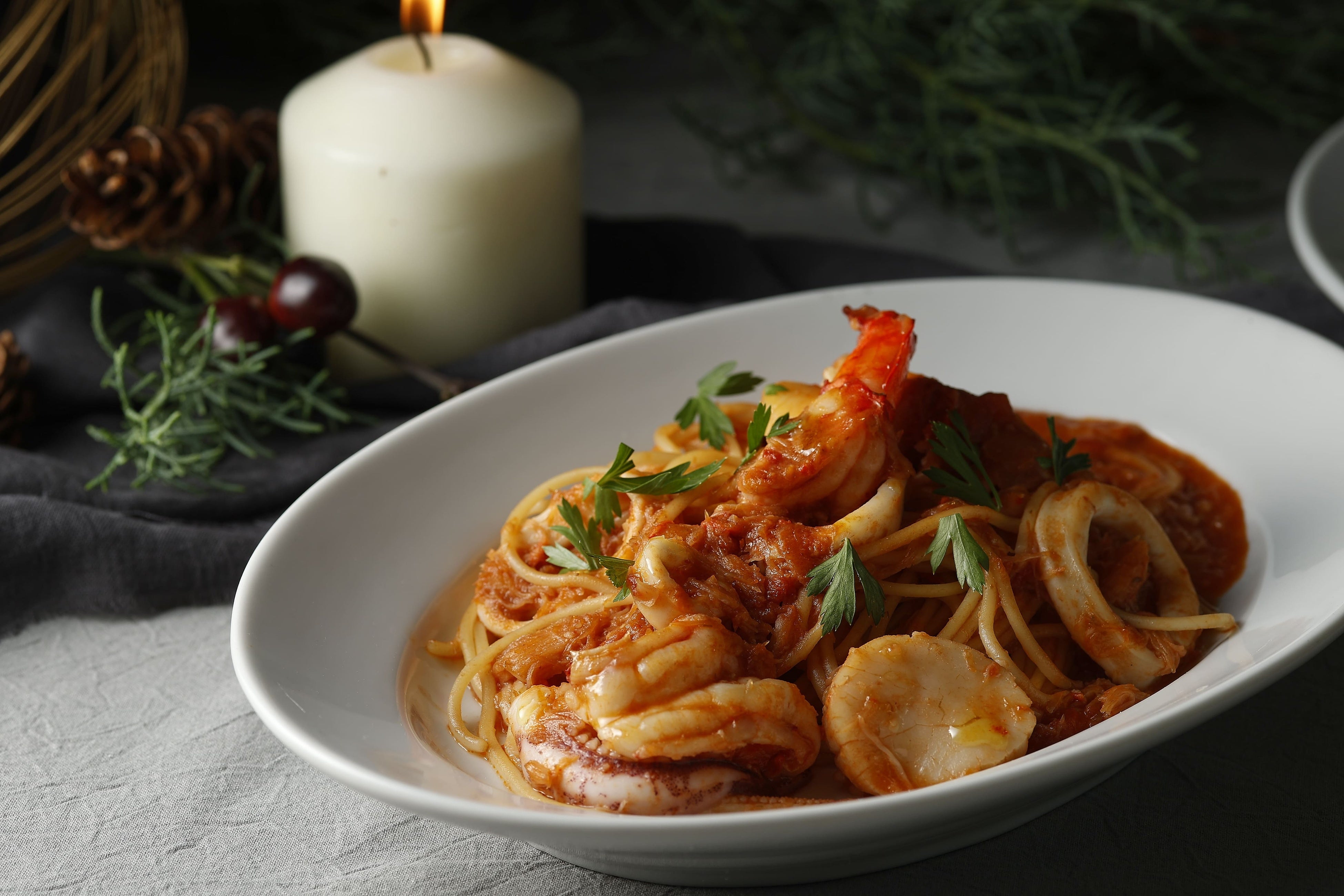 大海老、ズワイガニ、イカ、ホタテなどの新鮮な魚介をふんだんに使用し、自家製麺と魚介の旨味がたっぷり感じられる一皿。濃厚な蟹味噌トマトベースのソースが、贅沢な魚介と絶妙に絡み合い、至福のひとときを演出します。