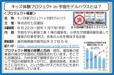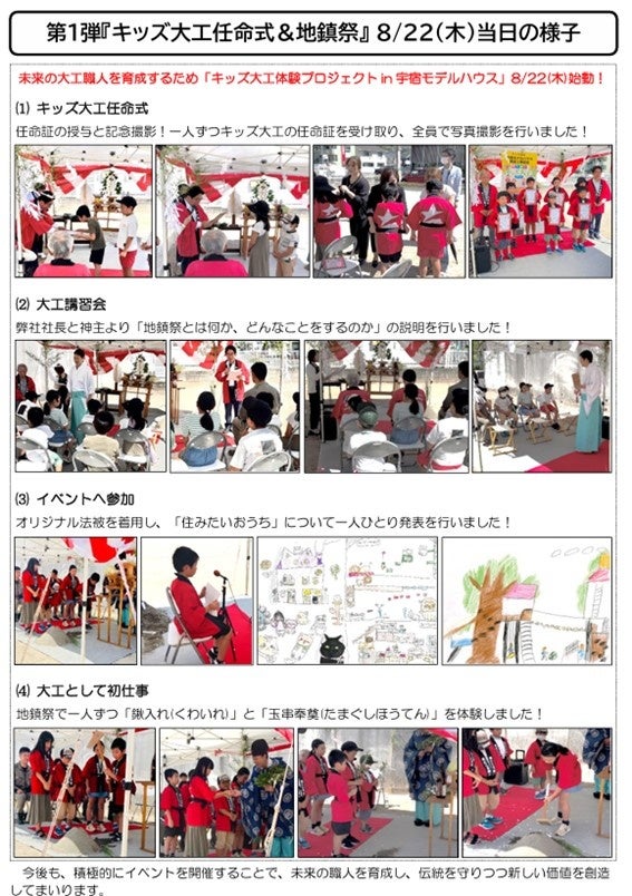 九州全域で展開するハウスメーカーで今年で創立64年を迎える株式会社七呂建設(本社:鹿児島市石谷町、代表取締役社長:七呂恵介)は、未来の職人を育てることを目的とした「キッズ大工体験プロジェクトin宇宿モデルハウス(全3回)」を展開しています。第1弾の「キッズ大工任命式&地鎮祭」を8月22日(木)に開催し、大好評でした。