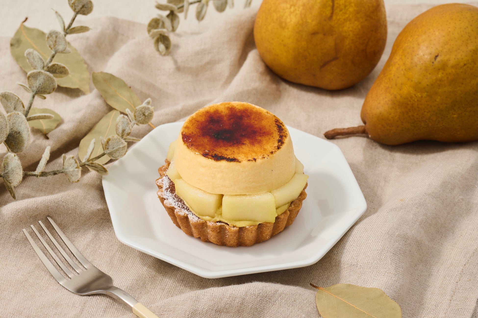と香ばしいタルトに、フレッシュのラ・フランスを飾り、コクのある口どけなめらかなシブ