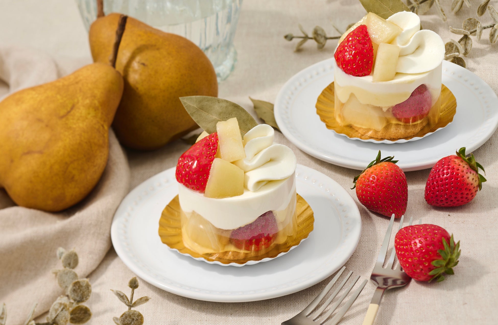 ずみずしいラ・フランスの食感と苺の酸味、まろやかなクリームとの相性をお楽しみいただ