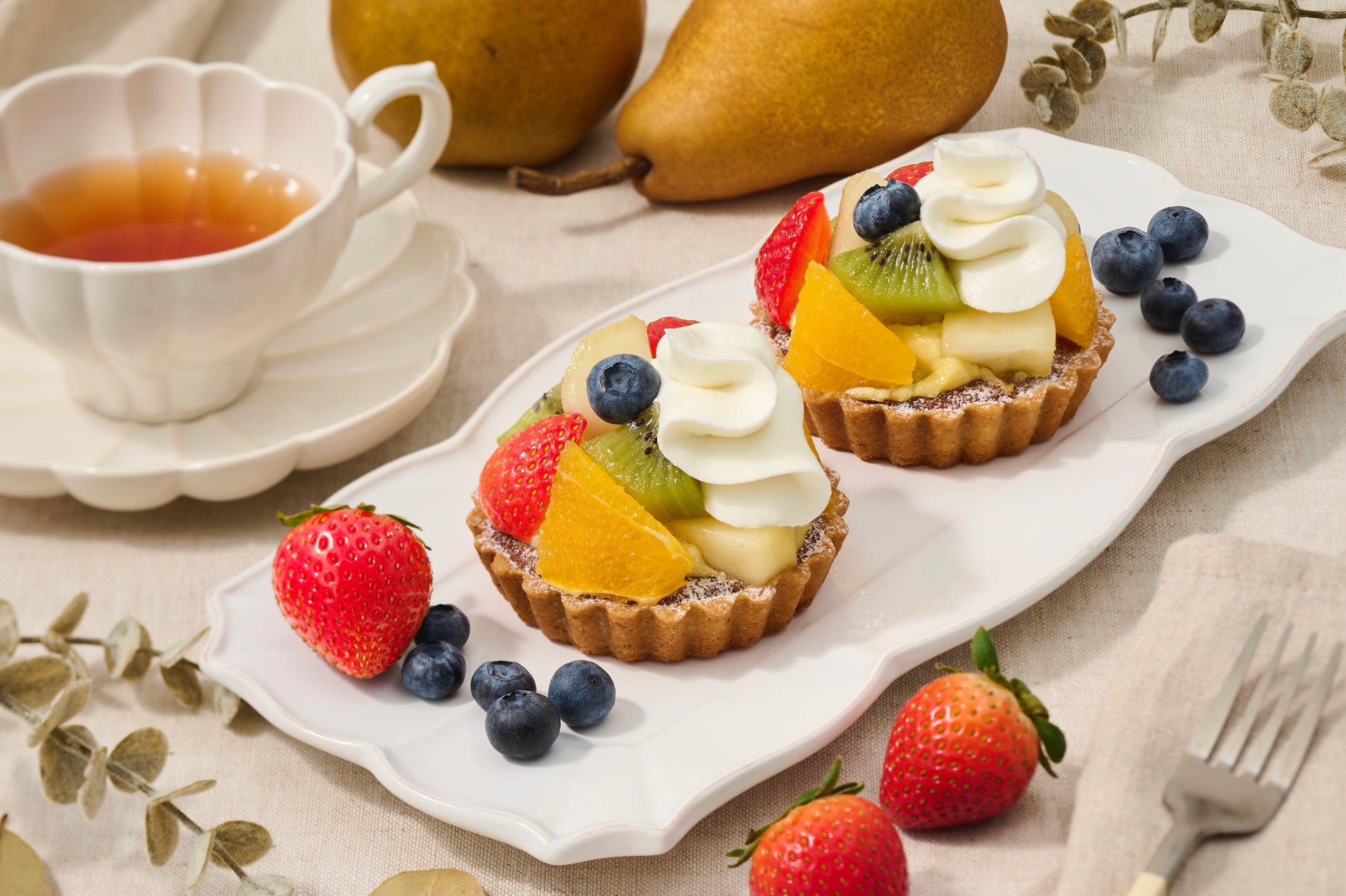 クッと香ばしいタルト生地に、なめらかなカスタードを絞り、ラ・フランス・苺・オレン