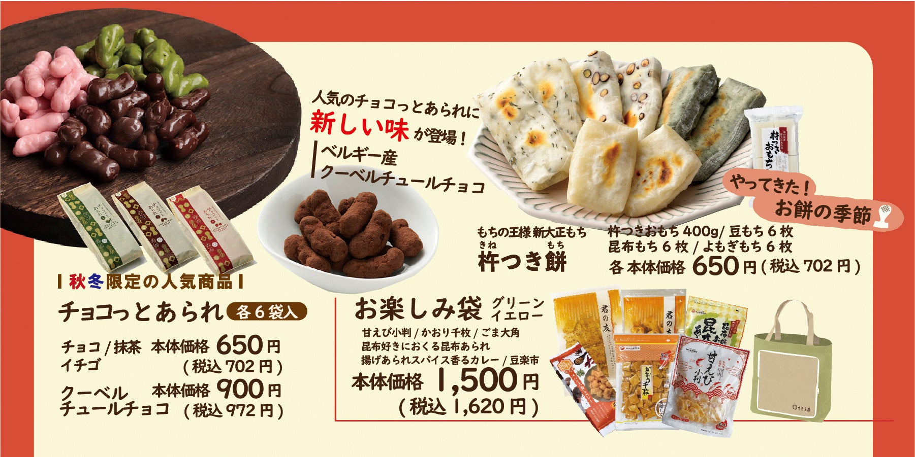 ささら屋オリジナルエコバックに入ったお得な「お楽しみ袋」、「よりどり3袋企画」の工場祭限定商品もご用意。秋冬の人気商品「チョコっとあられ」「杵つき餅」、新商品ほたるいか使用のせんべい「ほたるのひかり」など。おすすめ米菓と北陸の美味しい食べ物を取り揃えてご来店をお待ちしています!