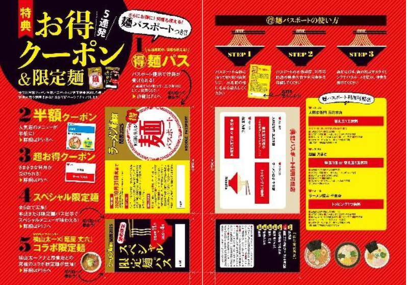 巻頭の目玉コンテンツでは、人気のスペシャル特典がさらにお得に。有効期間中なら何度でも特典が受けられる「麺パスポート」をはじめ、無料や半額で絶品ラーメンを試食できるクーポンなど、“お得”が盛りだくさん。毎年好評の限定麺企画では、切り取って持ち運べる「限定麺パス」も付いて、本誌を持参せずとも「限定麺パス」の提示で限定メニューが楽しめるようになりました。