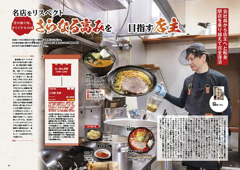 2023年秋~2024年9月までにオープンした新店50軒以上の中から、チェレンジ精神旺盛なニューカマーを紹介。夜限定オープンで2種の煮干し系が楽しめる「煮干しラーメン専門店 煮干しの息吹 」や貝ダシが決め手の「麺翔海神」、酒田のラーメンの代表格「ワンタンメンの満月 本店」がプロデュースする「食堂 港の月」、コスパ抜群で満腹必至の「中華そば つけ中華 まぜそばヨッチャン」など、山形で今注目すべきラーメン店を発表します。