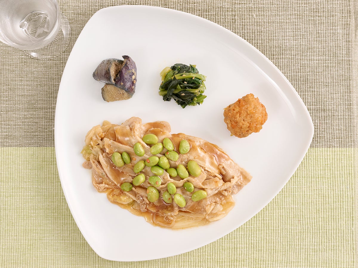 ふわっと香る、八角の香りがたまらない!柔らかく蒸しあげた豚バラ肉に、八角、生姜等の香辛料の風味を効かせた、香り豊かな甜醤油(テンジャンユ)ソースをたっぷりとかけた逸品の登場です。甜醤油とは、中華料理で使われることの多い、甘みが特徴の醤油。そこにピリッとした辛味を付け加え、絶妙な味わいに仕上げております!特製のソースに具材をしっかり絡めてお召し上がりいただきたいです! 副菜は、茄子のごまだれ、小松菜のねぎ醤油、チリ団子です。