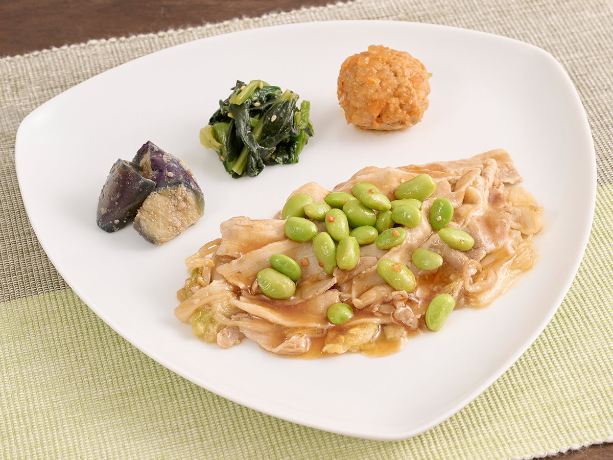 ふわっと香る、八角の香りがたまらない!柔らかく蒸しあげた豚バラ肉に、八角、生姜等の香辛料の風味を効かせた、香り豊かな甜醤油(テンジャンユ)ソースをたっぷりとかけた逸品の登場です。甜醤油とは、中華料理で使われることの多い、甘みが特徴の醤油。そこにピリッとした辛味を付け加え、絶妙な味わいに仕上げております!特製のソースに具材をしっかり絡めてお召し上がりいただきたいです! 副菜は、茄子のごまだれ、小松菜のねぎ醤油、チリ団子です。