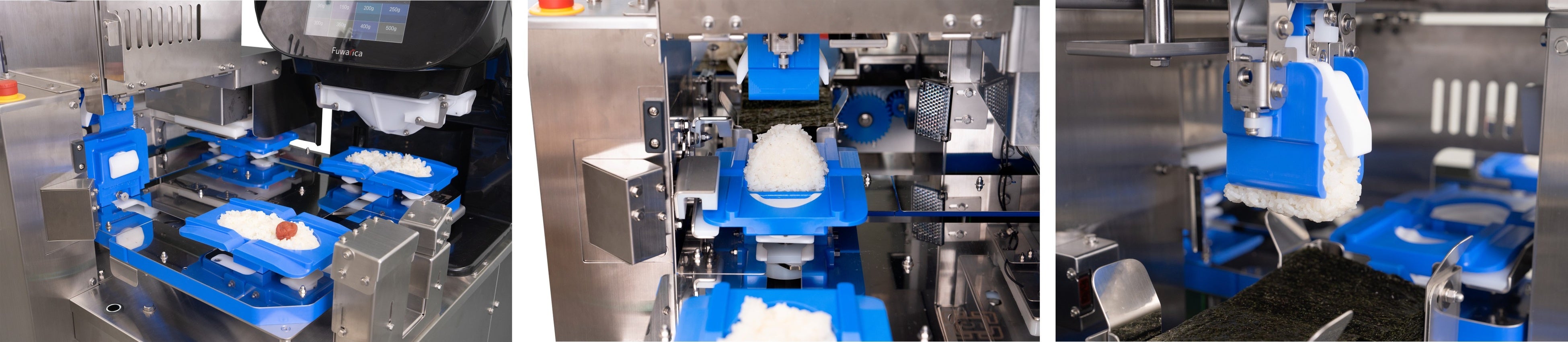 「ご飯盛り付けロボットFuwarica」で盛付けたごはんを半自動でおにぎりに仕上げていきます。ごはんを人の手でふんわりふっくら均一に盛り付けることは、技術を要し難しいと言われていますが、今回の新製品では安定して、一定のペース(360個/h)でおにぎりを作ることができます。さらに、ふんわりふっくらのおにぎりをつぶすことなく、絶妙の掴み具合で機械アームにより持ち上げて海苔付けする工程は当機器ならでの強みの1つです。
