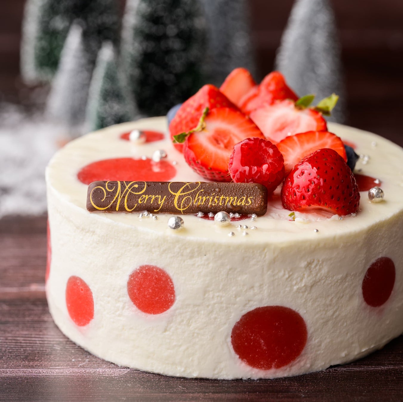 イチゴとフランボワーズのジュレで表面をドット柄に飾り、ジュエリーのような華やかさを演出したクリスマスケーキです。香り豊かなブランデーとバニラが溶け込んだ厳選生クリームを使用し、ふわふわのスポンジとたっぷりの自家製イチゴコンフィチュールが中に広がります。トップには鮮やかで甘みたっぷりの「とちおとめ」を飾り、見た目も味も満点。