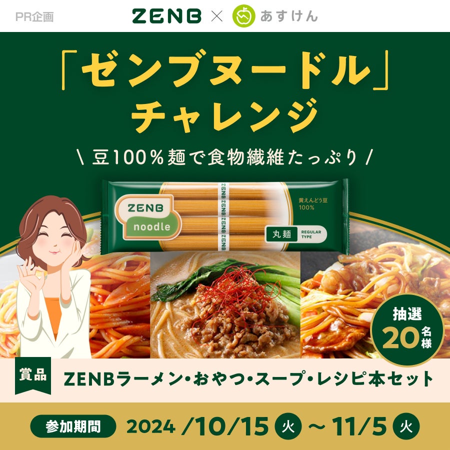累計会員数1,100万人以上のAI食事管理アプリ『あすけん』で開催中の「食物繊維を適正にしよう!豆100%麺『ゼンブヌードル』チャレンジ」企画に参加すると、チャレンジ内容を達成した方の中から抽選で20名に、本書籍やZENB商品の詰め合わせセットをプレゼントします。