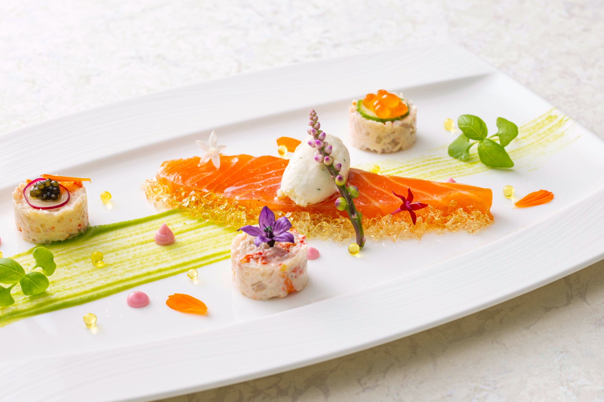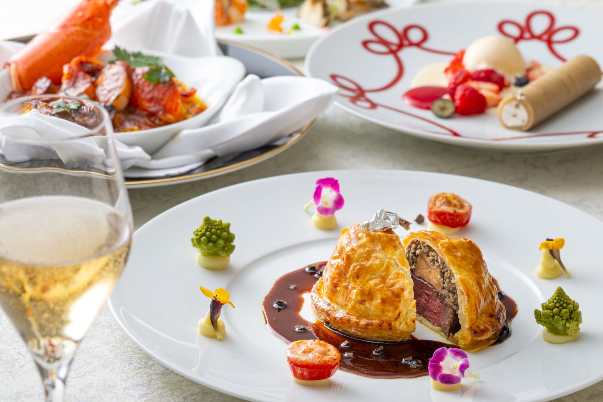 ランチは、国産フィレ肉のグリルをメインに、ホリデーシーズンならではの装いの前菜やデザートが楽しめるコースをご用意。ディナーは、王道のフレンチをモダンスタイルで麗しく仕立てたクリスマスならではの華やかなコースを。アワビ、キャビアも添えた海鮮のサラダは華やぐツリー仕立てに。メインディッシュは、フォアグラを重ねた牛フィレ肉のパイ包み“ウェリントン”風をトリュフ香るソースで仕上げました。愛らしいアミューズからデザートのブッシュ・ド・ノエルまで、聖夜の情景が映るディナーを五感でご堪能ください。