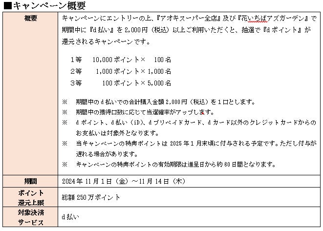 当社は2024年11月1日から14日までの間、『d払い』で2,000円(税込)以上お支払いいただくと抽選でdポイントが最大10,000ポイント還元される大変おトクなキャンペーンを実施します。
