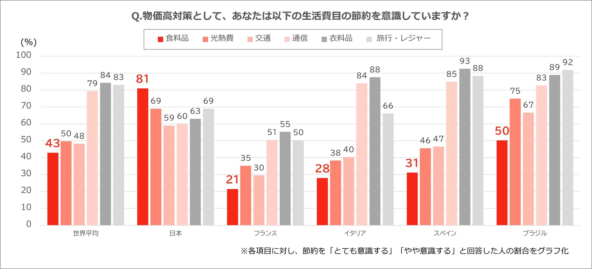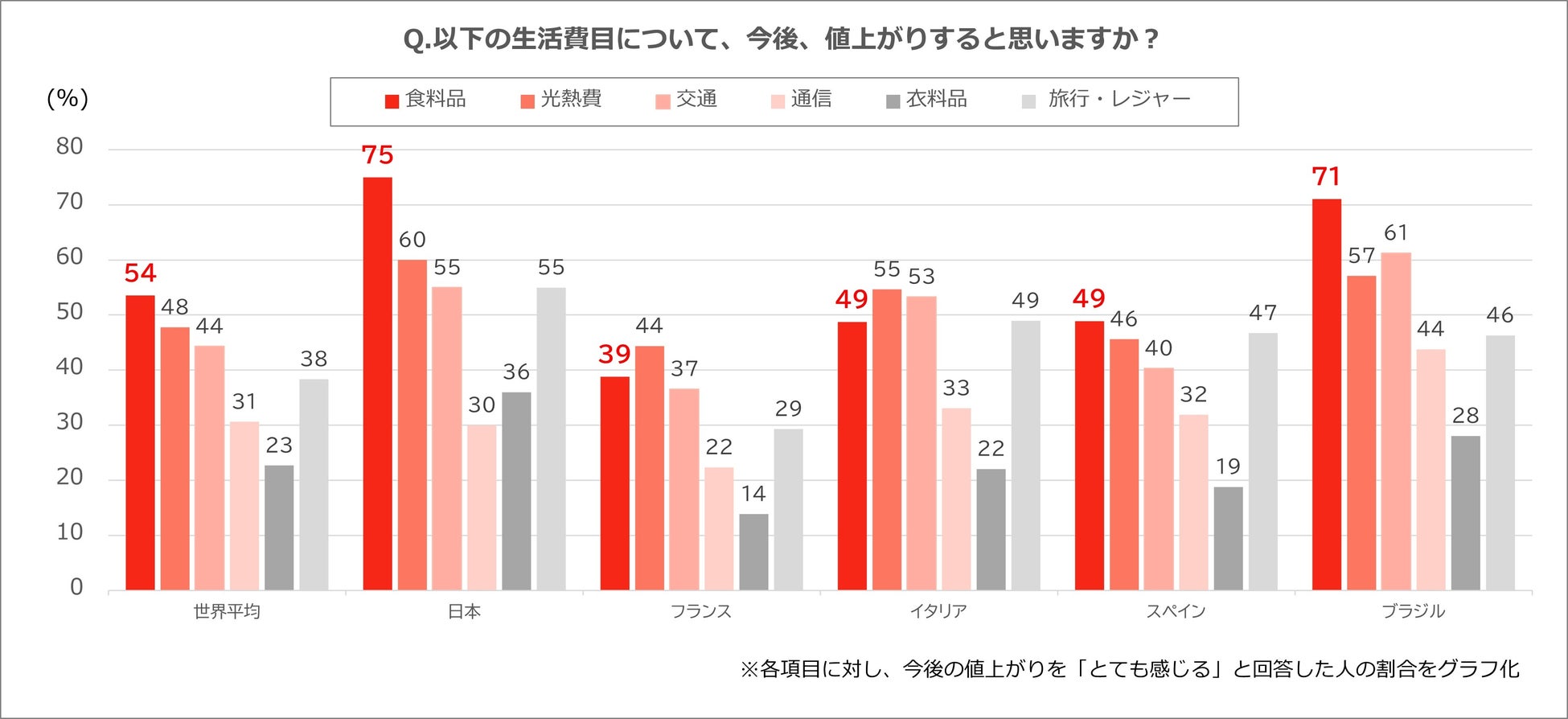 ■日本はほとんどの費目で世界平均よりも値上がりすると感じており、節約志向が顕著