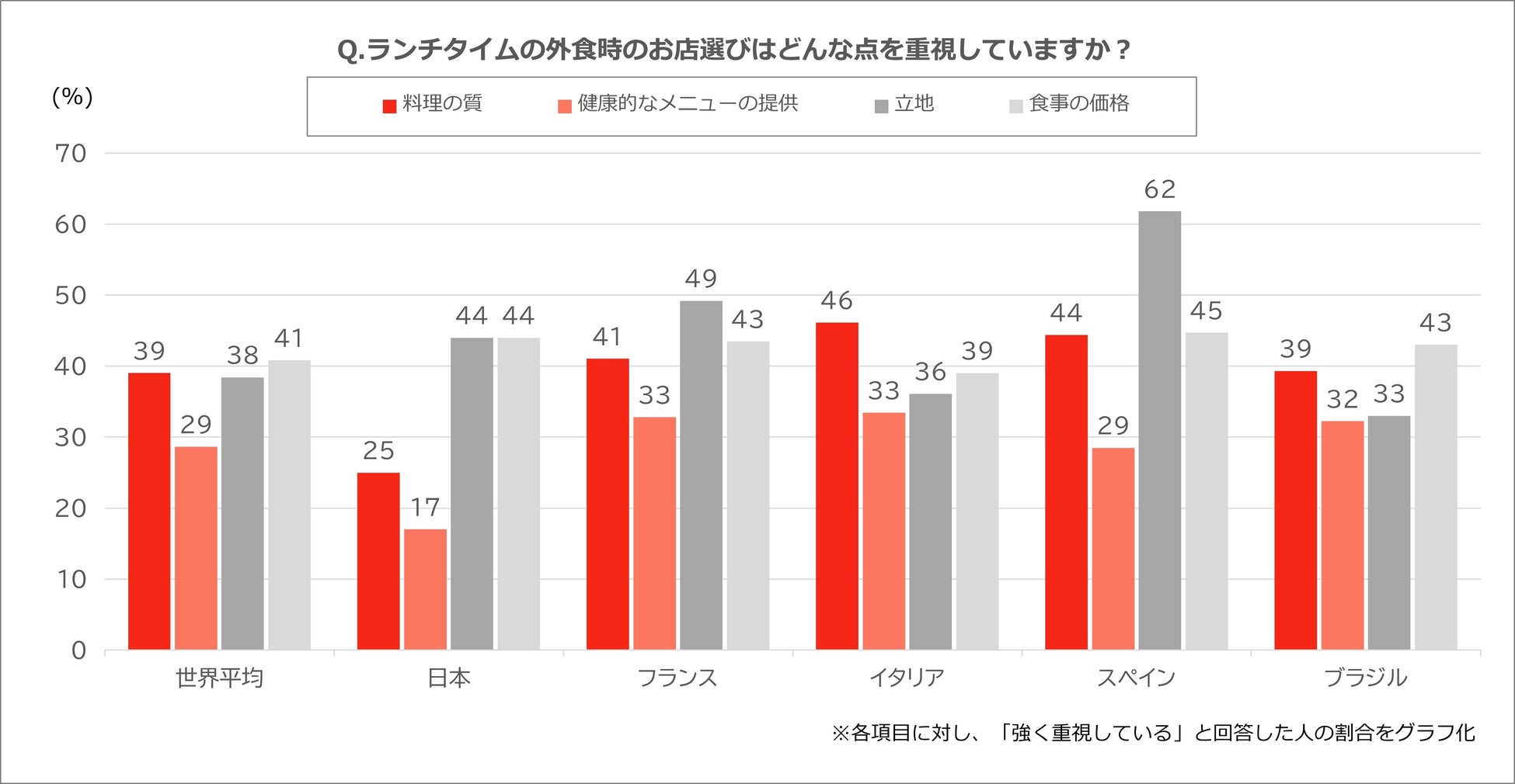 ■ランチ選びの基準、日本は世界各国と比較し、料理の質や健康面を重視する人が