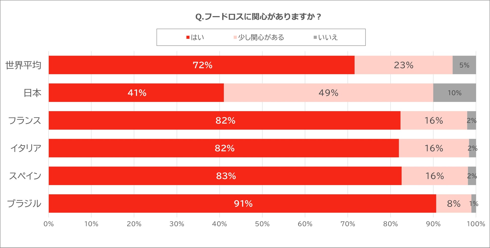 昨年から引き続き、今回の調査でも年々意識が高まるフードロスについて調査しました。フードロスに関心があるか聞いたところ、「はい」と回答した日本人はおよそ4割(41%)。一方、他国では、「はい」との回答が8割以上にのぼる国も多く、世界平均は7割以上(72%)となりました。