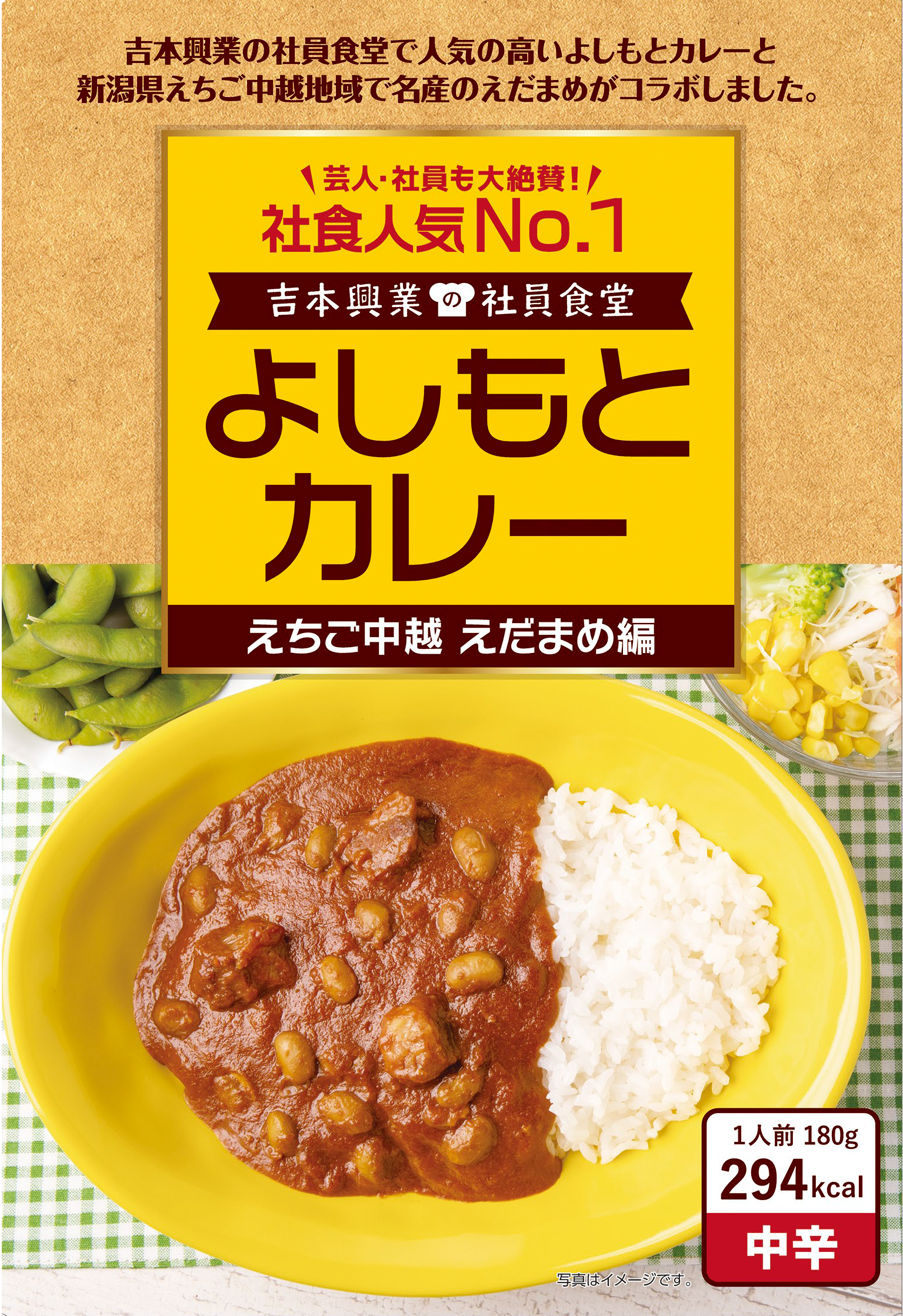 吉本興業東京本部にある社員食堂で最も人気の高いメニュー「よしもとカレー」と、新潟県えちご中越の地域食材である「えだまめ」のコラボレーション商品『よしもとカレー えちご中越 えだまめ編』 が完成し、10月26日(土)に発売されます。