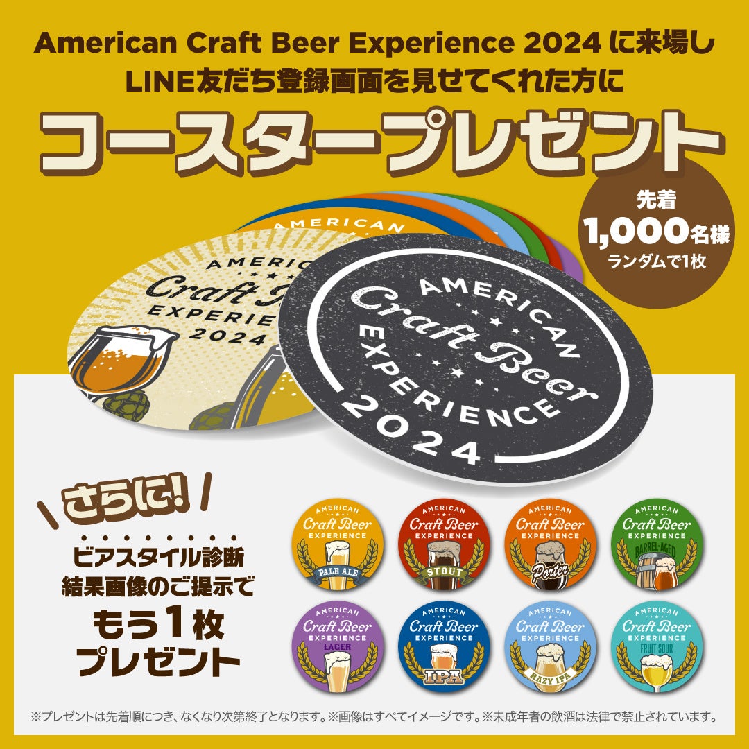 「American Craft Beer Experience 2024」に来場し、コースター引き換えコーナーでLINE友だち登録画面を見せていただいた方先着1,000名様にACBEオリジナルコースターをランダムで1枚プレゼント。