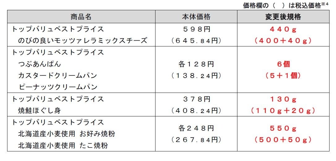 またトップバリュは、原材料の調達から計画生産、効率化を追求した店舗への配送等のサプライチェーン全体での合理的なコスト削減に努め、10月末まで※1に普段の暮らしでお客さまが 購入される頻度が高い商品約100品目を増量し、数量限定で発売します。さらに11月中旬からは、一部商品の値下げを予定しています※2。