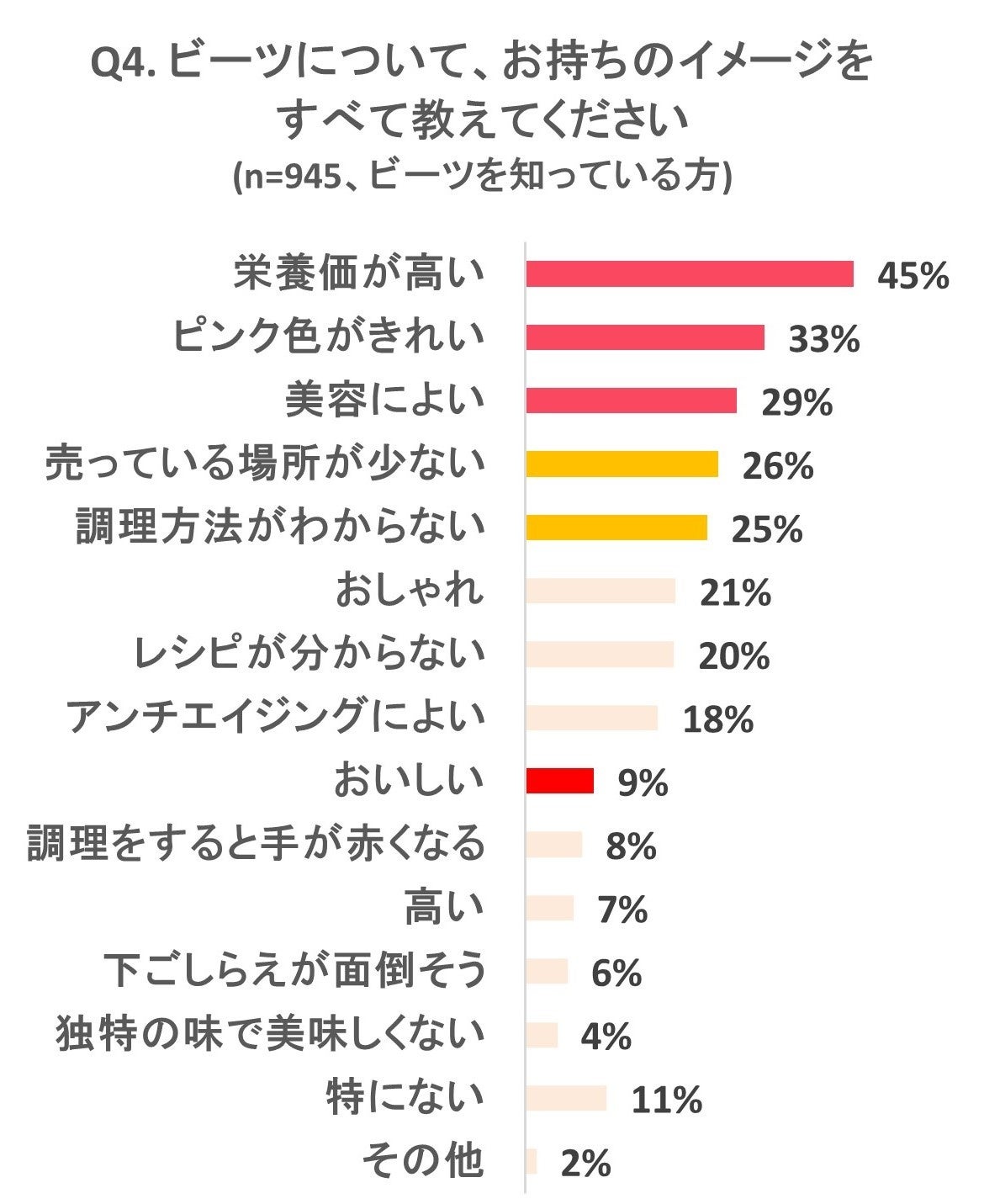 ビーツを知っている人にビーツのイメージを聞くと、「売っている場所が少ない」(26%)「調理方法が分からない」(25%)という回答が一定数集まったほか、「おいしい」イメージはわずか9%のみの回答。その一方で、「栄養価が高い」(45%)、「ピンク色がきれい」(33%)、「美容によい」(29%)などのポジティブな回答が多い。
