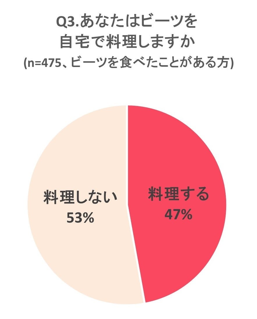 「ビーツを知っているか」と尋ねたところ、61%が「知っている」と回答(Q1)した一方でビーツを食べたことがあるのはわずか31%で(Q2)でした。さらにビーツを食べたことがある人に「ビーツを自宅で料理するか」尋ねたところ、自宅で料理をする人は47%にとどまることから(Q3)、認知はされているもののビーツがまだ身近な野菜ではないことが明らかになりました。