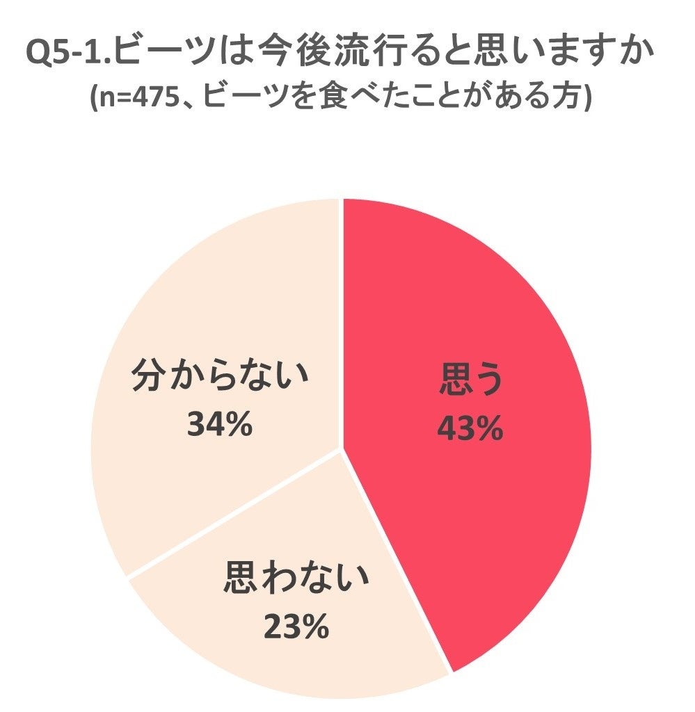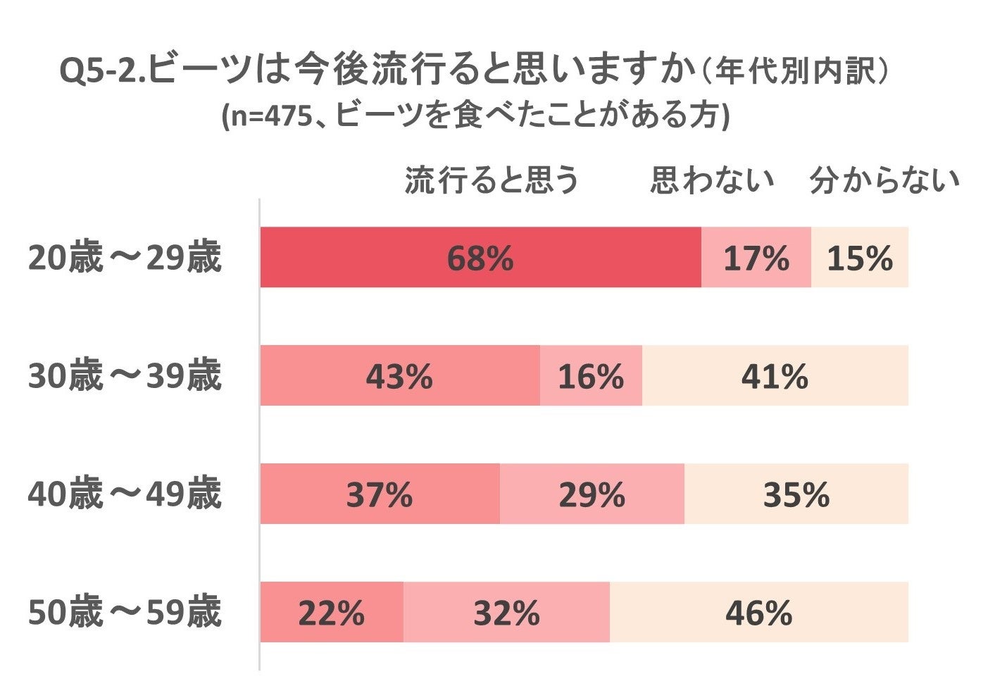 ビーツを知っている人にビーツのイメージを尋ねると、「売っている場所が少ない」「調理方法が分からない」など手に取りにくいイメージに回答が集まったほか、「おいしい」というイメージはわずか9%という結果に。その一方で、「栄養価が高い」「ピンク色がきれい」「美容によい」などのポジティブなイメージにも多くの回答が集まりました(Q4)。ビーツを食べたことがある人に「今後ビーツが流行ると思うか」と尋ねたところ、43%が「流行ると思う」と回答(Q5-1)。特に若い年齢ほどその傾向が高く、20代は68%が「流行ると思う」と回答しました(Q5-2)。