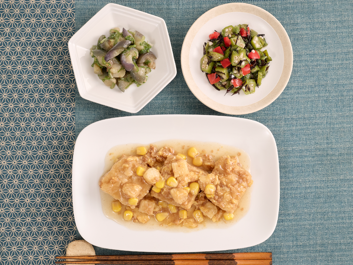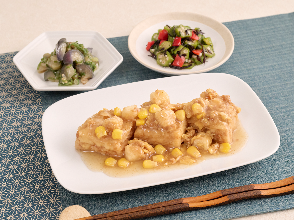 ふんわりと揚げたお豆腐に、卵、山芋、コーンと一緒に甘辛く仕上げた肉そぼろをたっぷり盛り込みました!山芋のシャリシャリとした食感も楽しめる、食べ応え抜群の一品です。