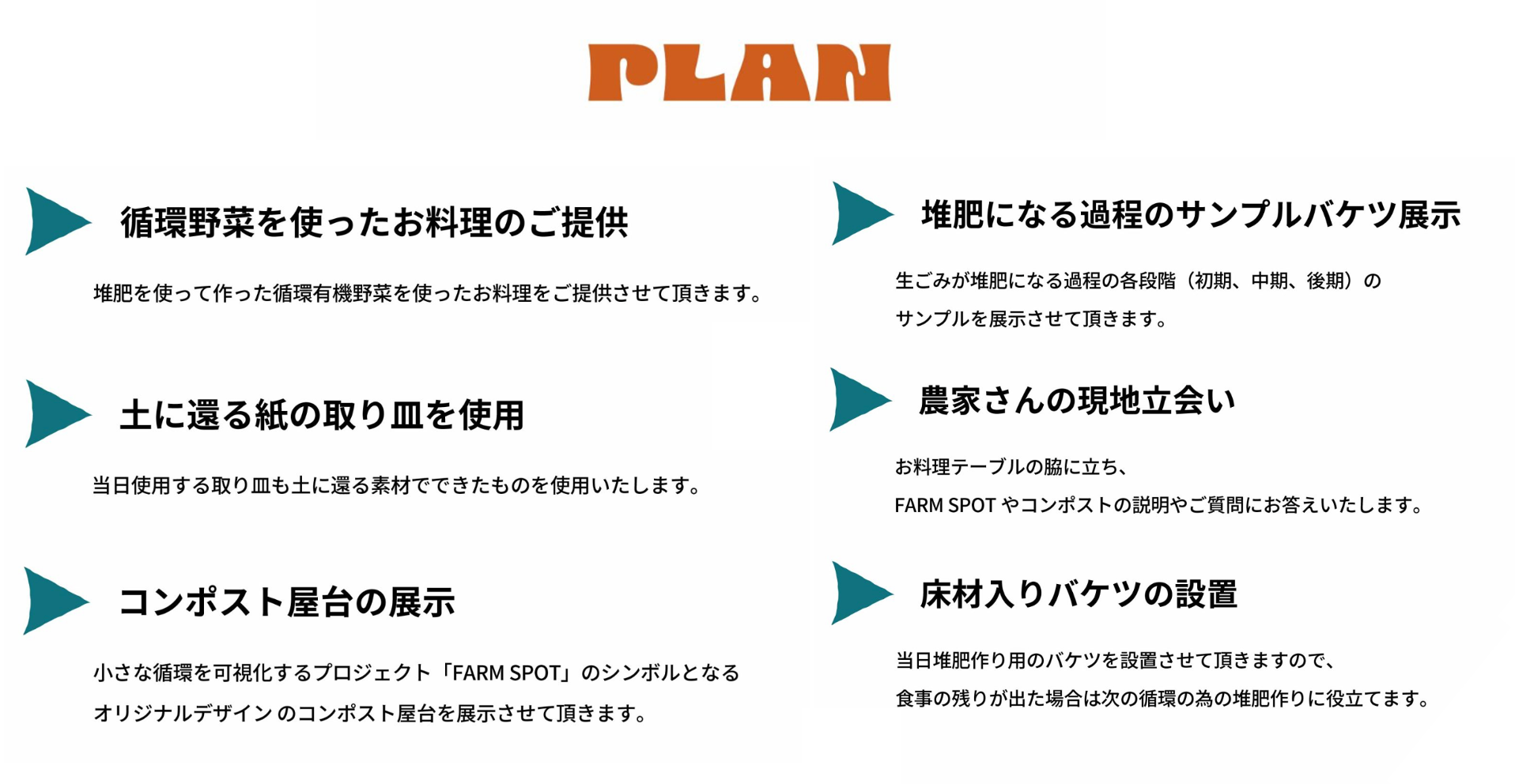 本プランは、“コンポストを起点とした場づくり”をコンセプトとしたプロジェクトチーム 『FARM SPOT』と連携し、飲食店やケータリング、交流会など、コミュニケーションが生まれる場で生じる生ゴミをただ捨てるのではなく、堆肥として循環させることで、新たな“価値”と“つながり”を生み出す場を創出するという『FARM SPOT』の概念のもと誕生しました。