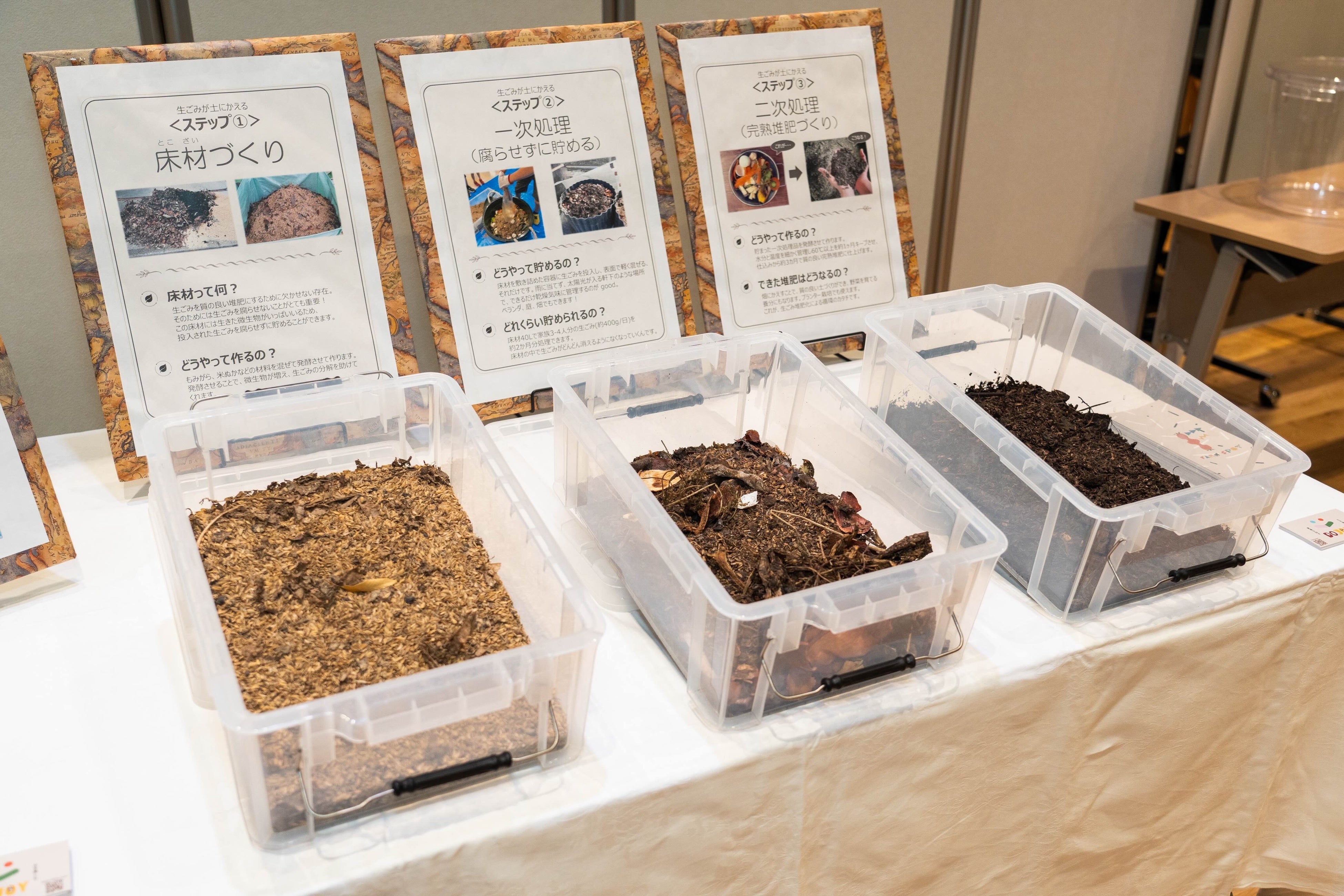 またコンポストの仕組みを目で見て理解できるよう、生ごみが堆肥になる過程(初期・中期・後期の段階)の