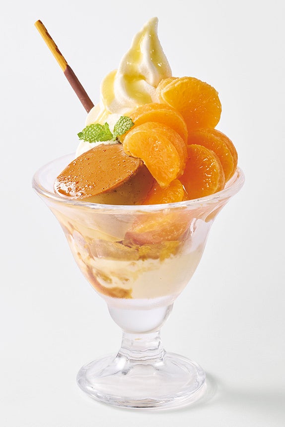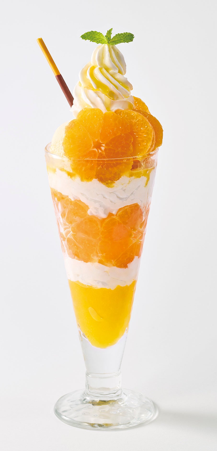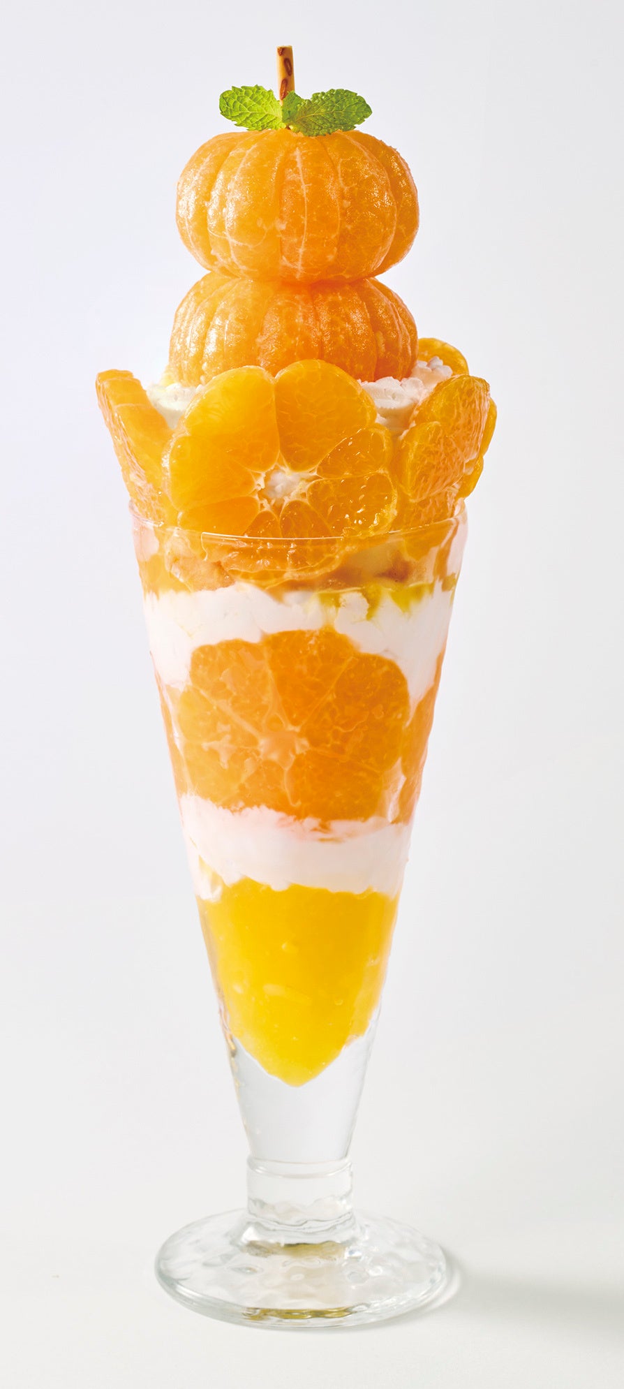 <パフェの中身> 早生(わせ)みかん・みかんゼリー・北海道ソフトクリーム・コーンフレーク・オレンジソース・バニラアイス・ホイップ・アロエ |