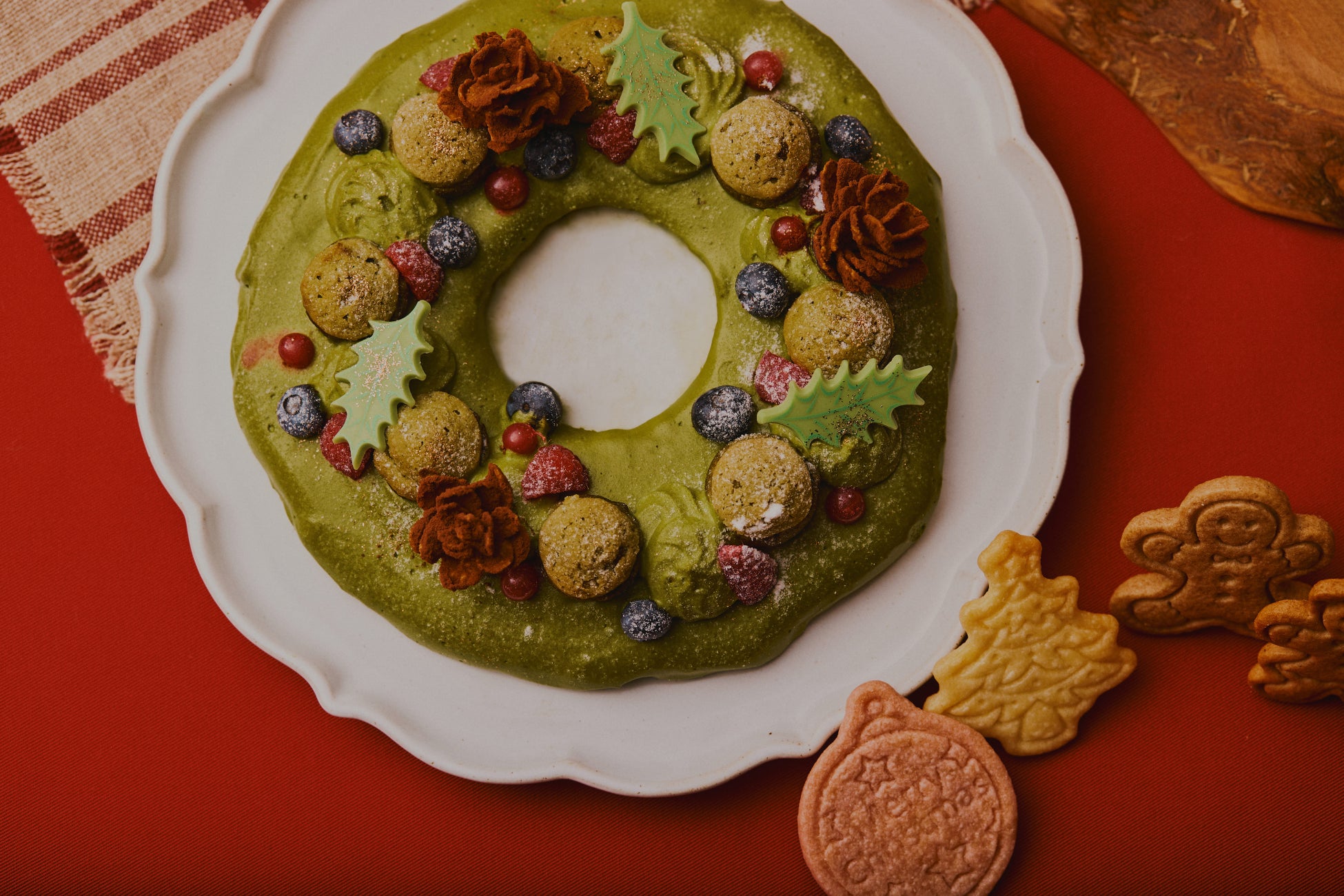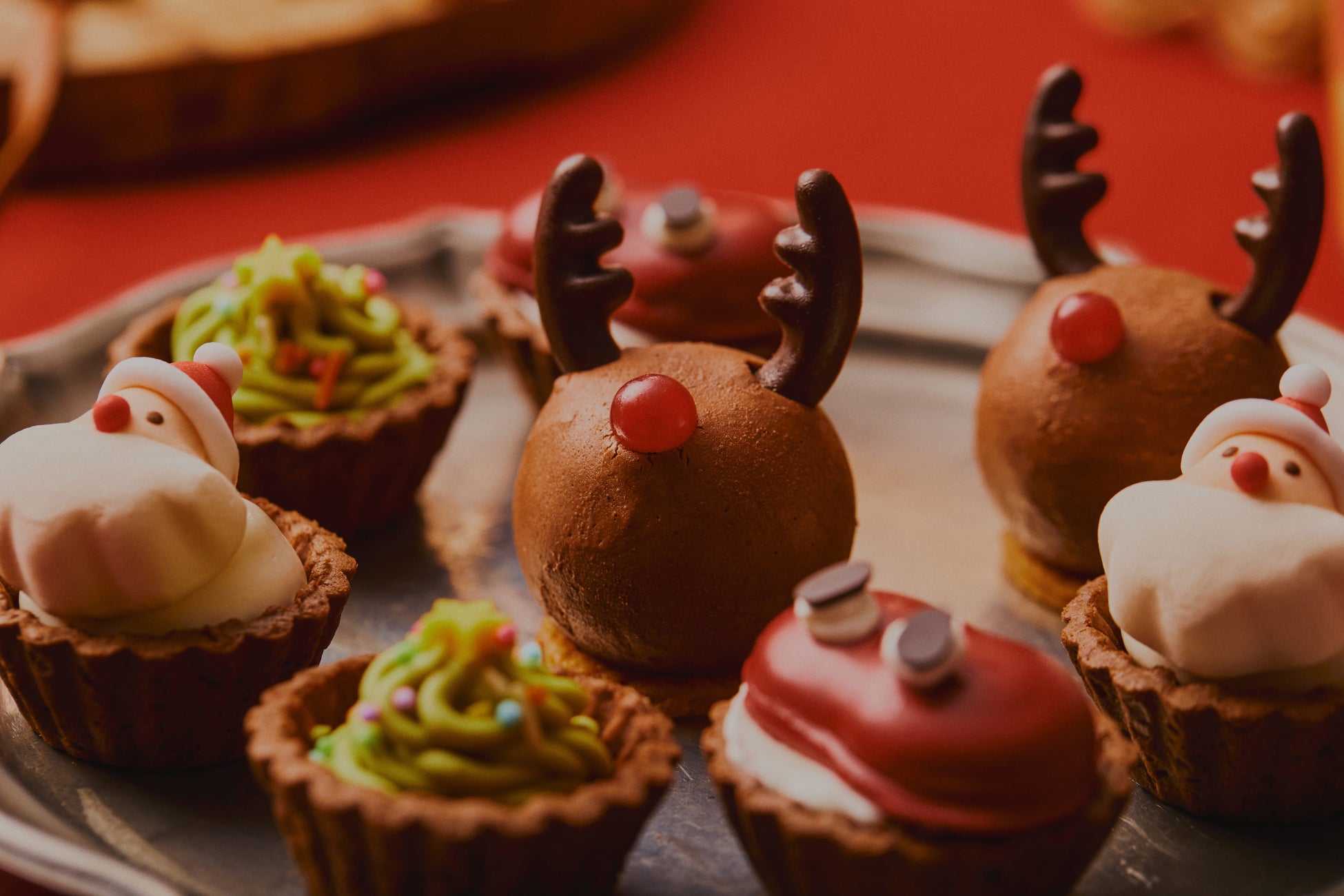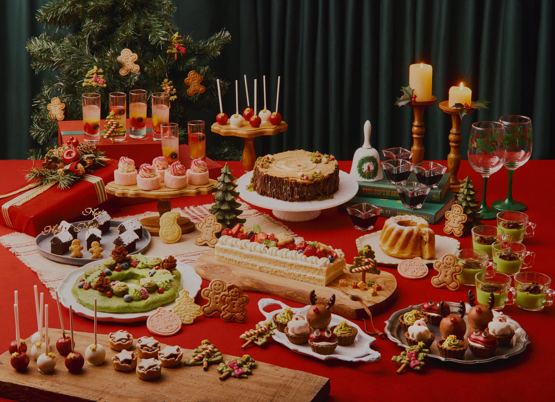 今回のスイーツビュッフェでは、フランス発祥でクリスマスならではの「ブッシュドノエル」をはじめ、特別な日に食べられる伝統菓子「サントノーレ」をクリスマススタイルにアレンジした「リースサントノーレ」や赤いお鼻のトナカイをモチーフにした「トナカイムース」、雪の中で転んでしまった「あわてんぼうサンタタルト」などクリスマスシーンを華やかに彩るスイーツをご用意します。軽食や、コーヒー、紅茶などのソフトドリンクとともにお楽しみください。