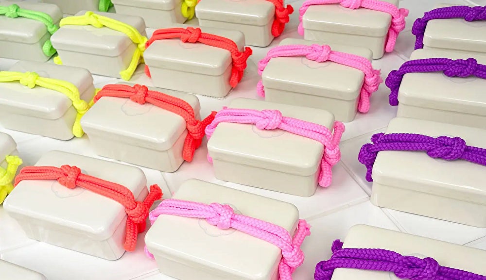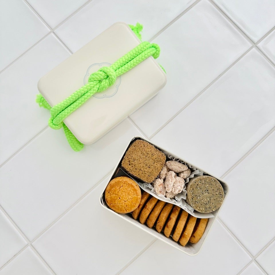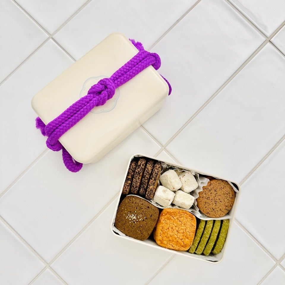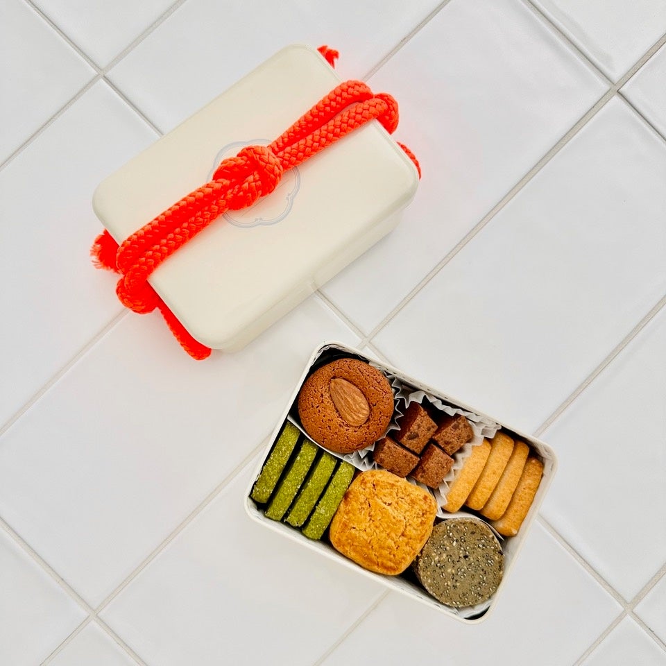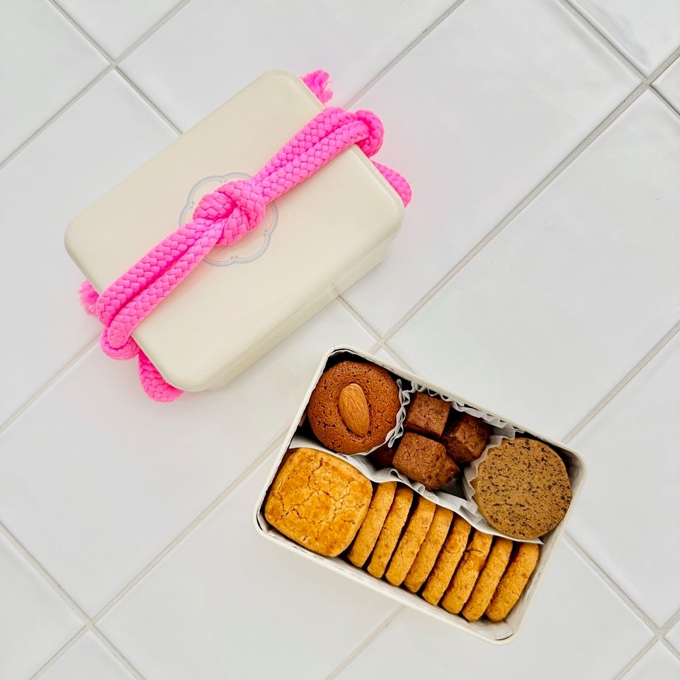 「谷六茶菓」のクッキー缶は、種類ごとに色分けされた鮮やかな紐で「帯締め」されている。「帯締め」は、日本独特の文化である「結び」の一つ。目を惹くデザインで、大切な人への贈り物や自分へのご褒美にもぴったりな一品となっている。